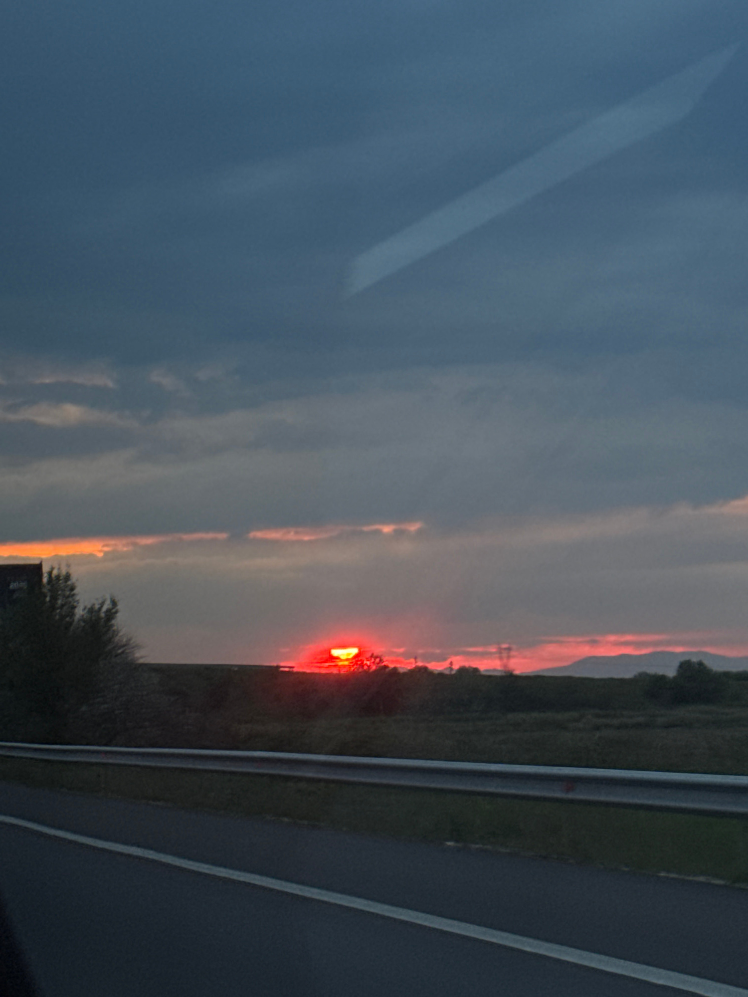 The image, rotated, captures a dramatic sunset scene viewed from inside a moving vehicle. The horizon runs vertically on the right side of the frame in the original orientation, but when viewed correc…read more