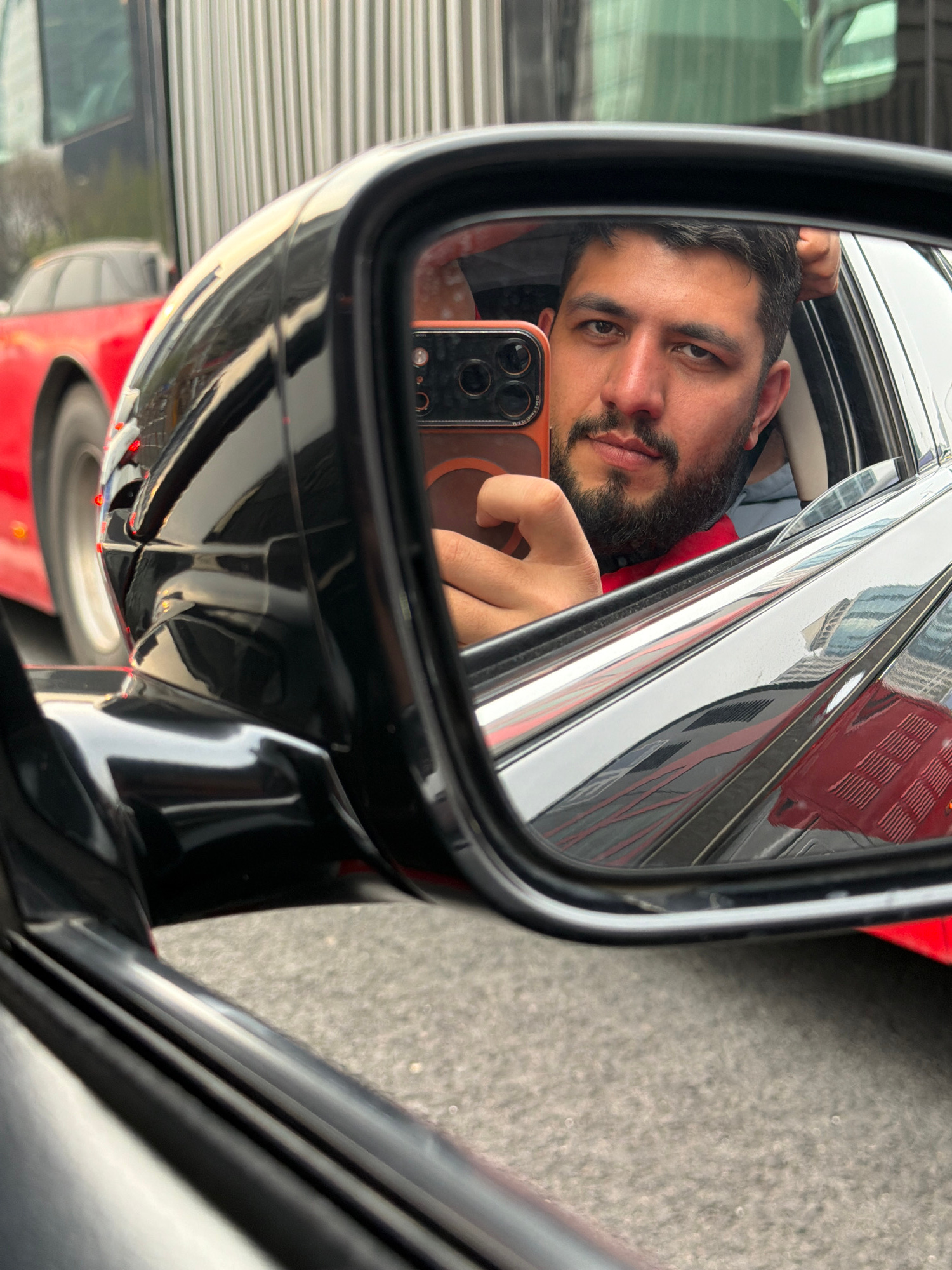 A person's face is visible in the side mirror of a car. The individual has dark hair, a beard, and is holding a smartphone. The reflection in the mirror shows a building exterior. The location is in C…read more