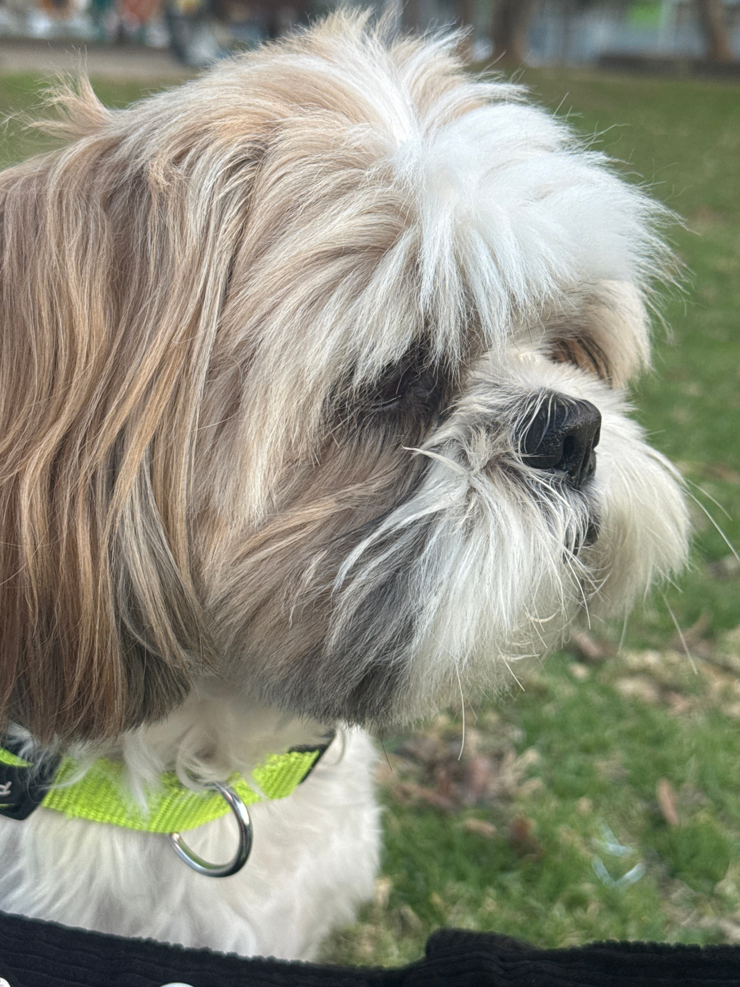 A close-up, high-angle shot depicts the head and upper body of a light-colored dog, possibly a Shih Tzu or similar breed, with white and light brown fur. The dog has a black nose and appears to be wea…read more