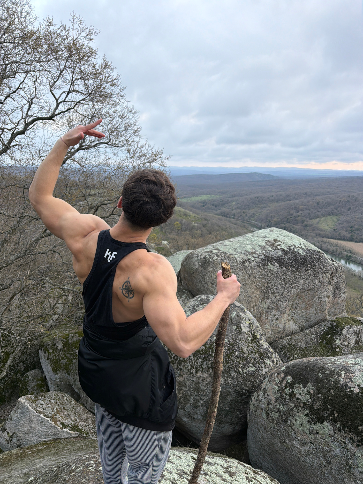 A man stands on a rocky outcrop overlooking a forest valley on an overcast day. He is viewed from behind, wearing a black tank top with the letters "HF" on it, striped pants, and a black vest. A compa…read more