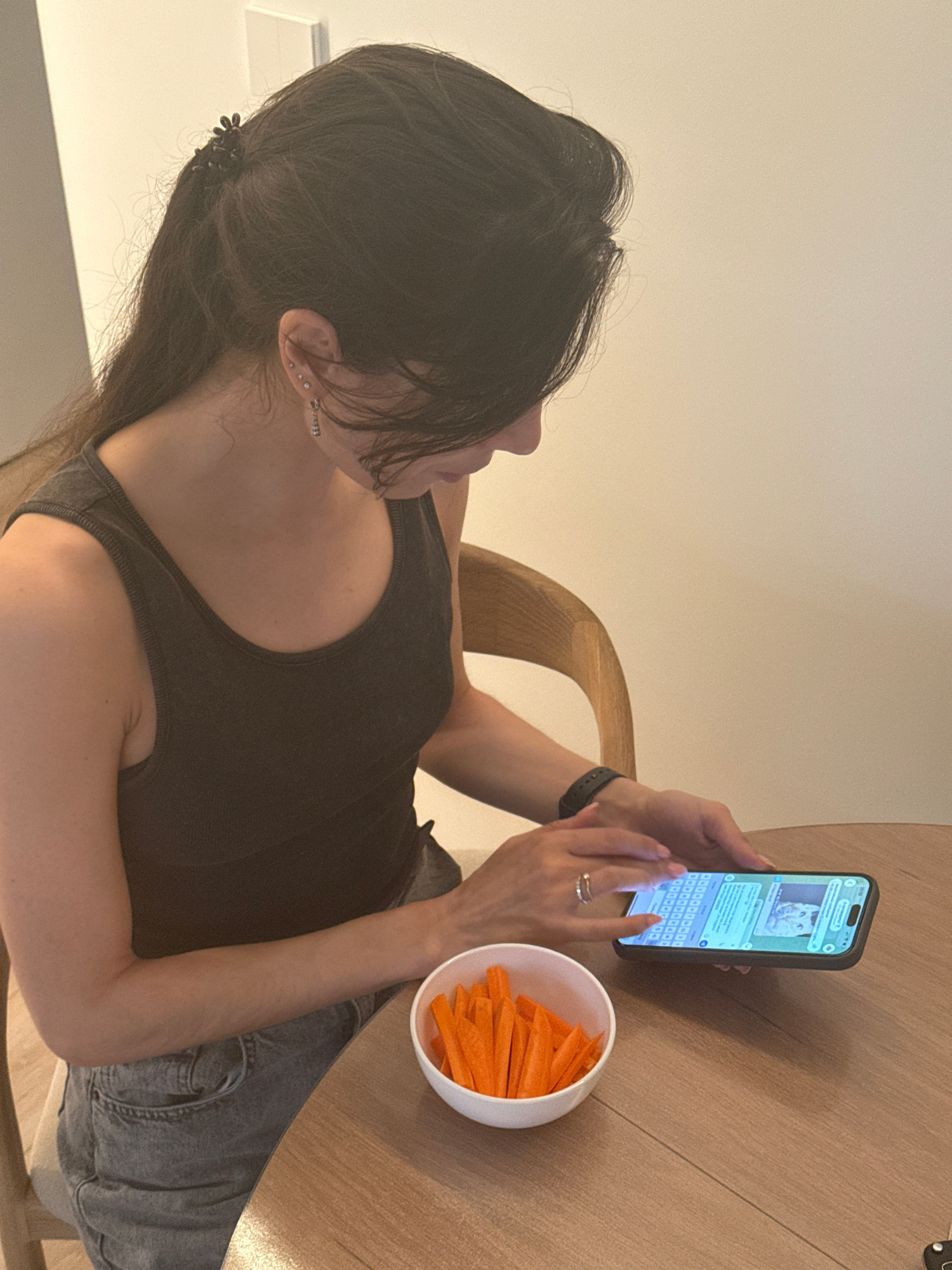 A woman sits at a light brown wooden table, holding a smartphone in her hands. On the phone screen is what appears to be a messaging app with a picture of a white cat at the top. The woman's finger is…read more