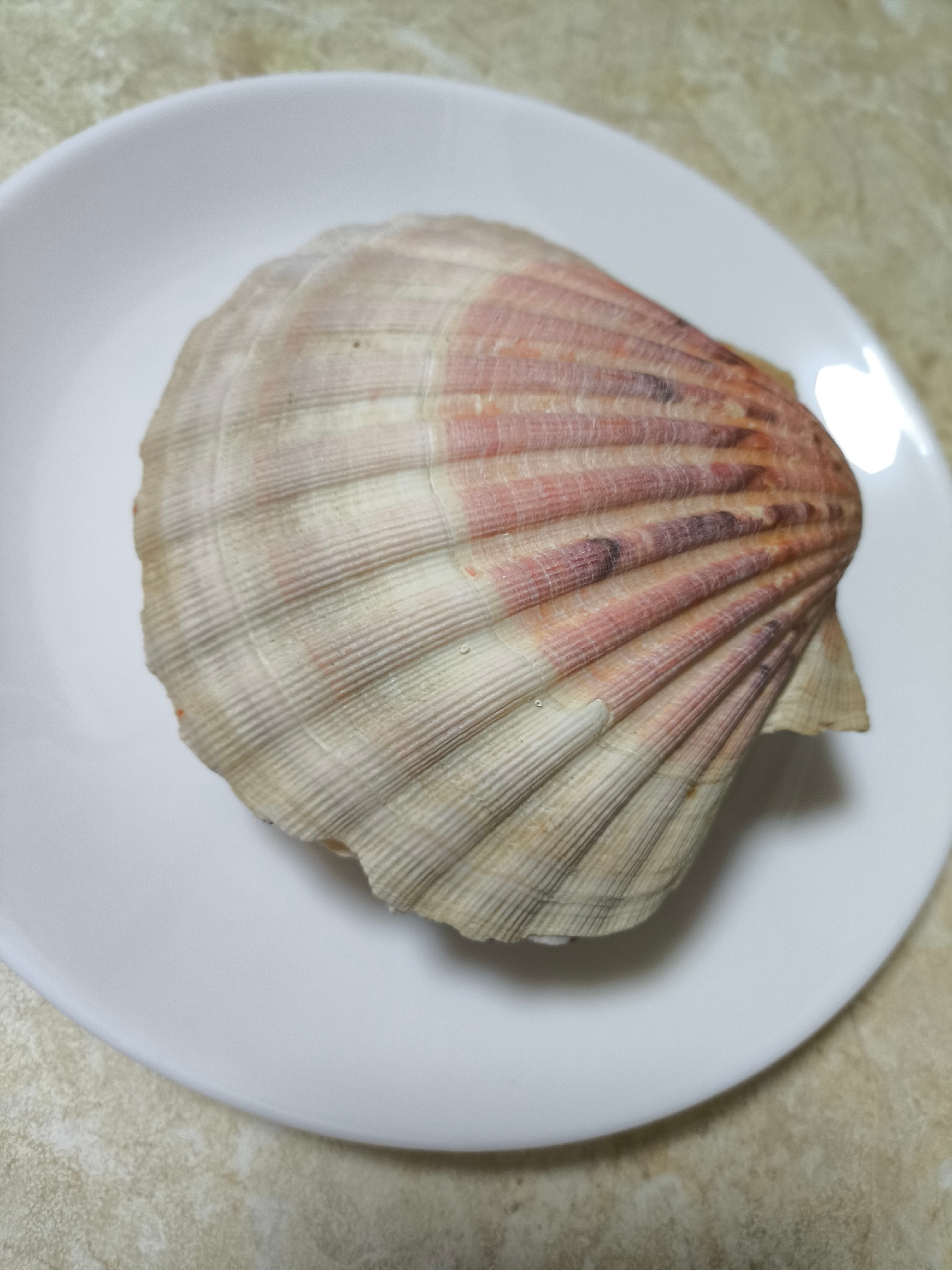 A single scallop shell sits on a white plate, which rests on a surface with a light-beige speckled pattern. The shell is mainly light beige, with pinkish-red hues concentrated towards the right side.…read more