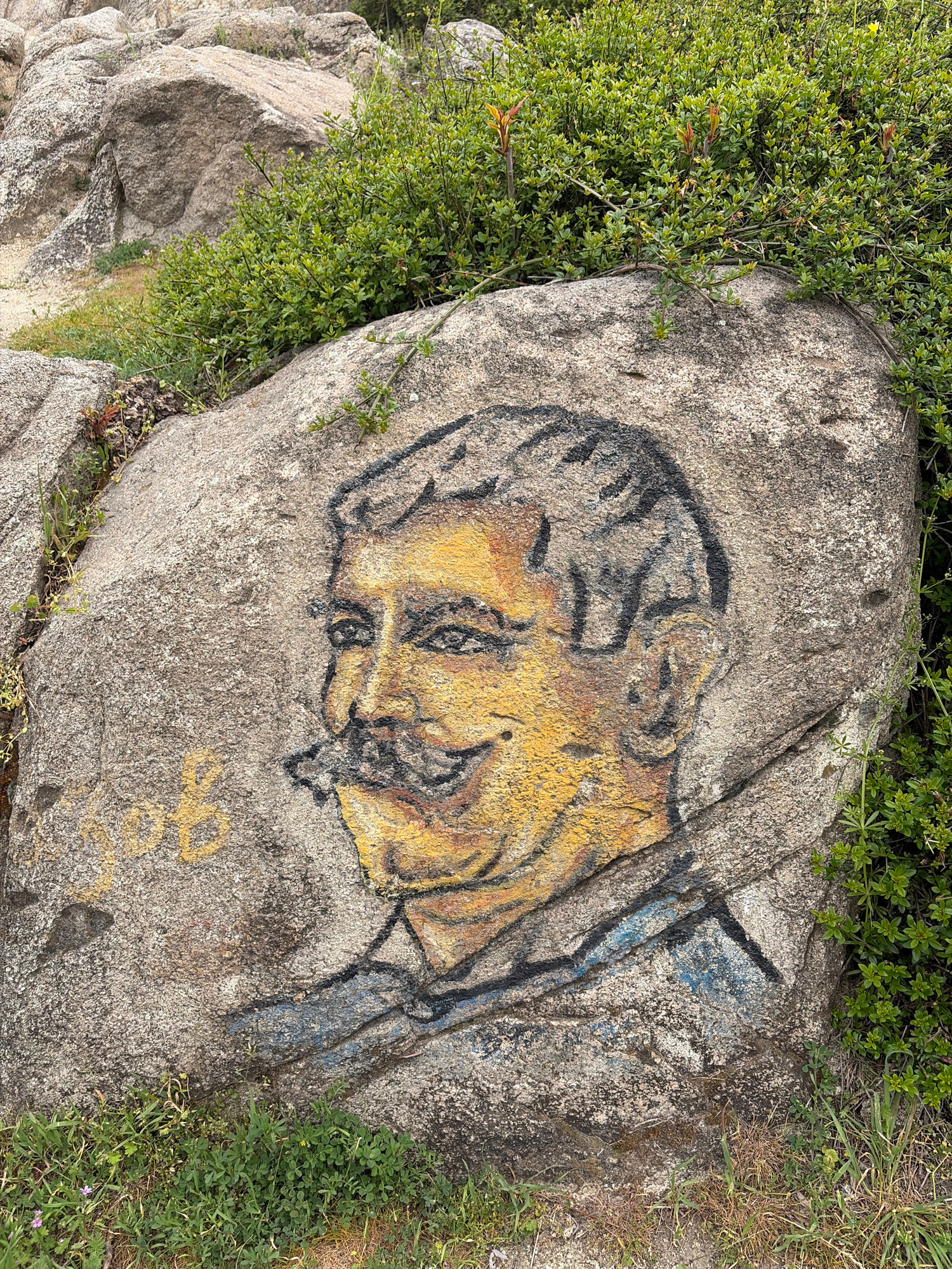 The image shows a large grey rock, partially covered in green vegetation. Painted on the rock is a stylized portrait of a human face, rendered in yellow and outlined in black. The image is faded and w…read more