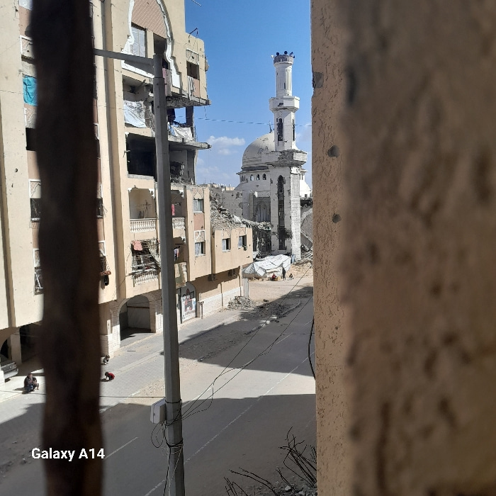 The image depicts a severely damaged urban street scene in Khan Yunis, Palestinian Territory, captured from an elevated perspective, likely a window or opening, on a clear, sunny day. The capture devi…read more