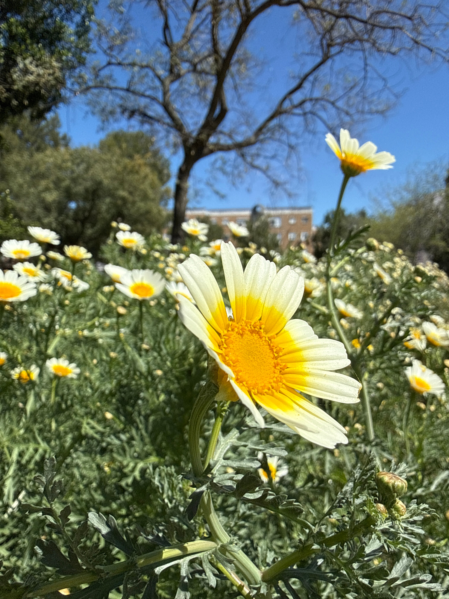 A ground-level shot captures a field of daisies in Huelva, Spain, with a clear, blue sky and tree branches visible in the background. The daisies are in varying stages of bloom. A building is partiall…read more