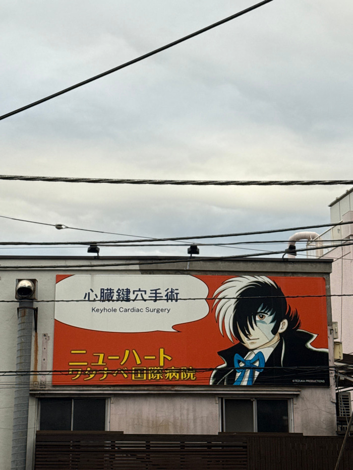 An outdoor advertisement for a medical facility is prominently affixed to the side of a multi-story building in Minato, Japan, under an overcast sky. The large rectangular sign features an orange-red…read more