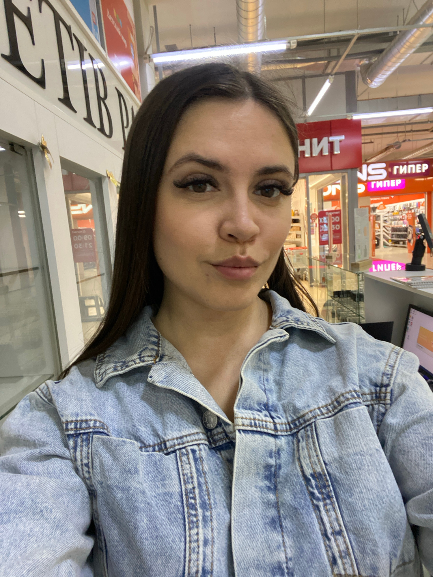 The image shows a woman wearing a light blue denim jacket, indoors, likely in a shopping mall in Chaikovsky, Russia. Store signs with Russian writing are visible in the background, including the word…read more
