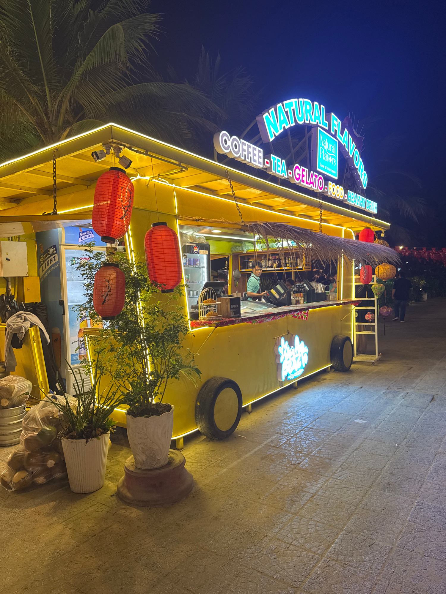 The image depicts a brightly lit "Natural Flavors" coffee, tea, gelato, and food establishment in Đà Nẵng, Vietnam, at night. The structure is yellow with neon trim and features red Chinese lanterns.…read more