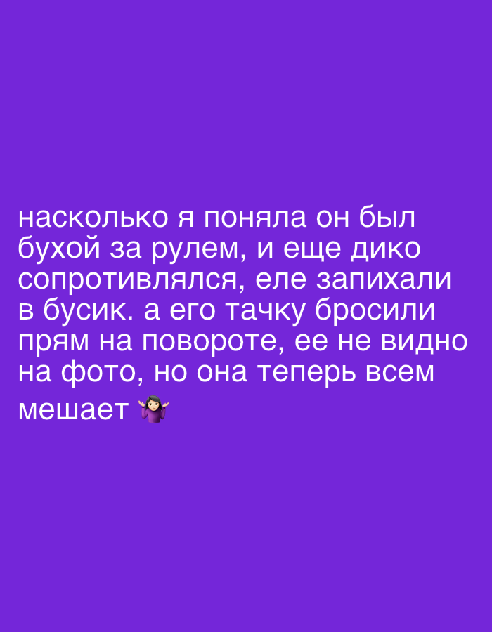 Here is a description of the image: The image shows white text in Russian against a solid purple background. The text indicates that someone was drunk driving and resisting arrest. The person was eve…read more
