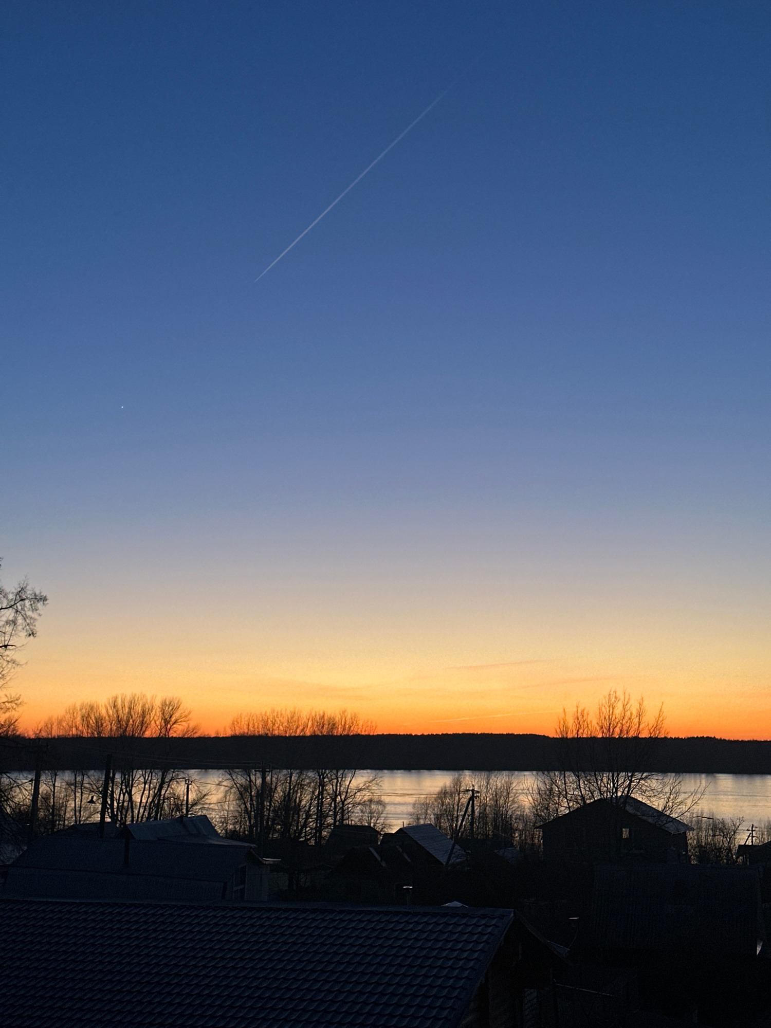 The image shows a sunset or sunrise over a body of water, possibly a lake or wide river. The sky transitions from a deep blue on the left to a gradient of orange and yellow near the horizon. A contrai…read more