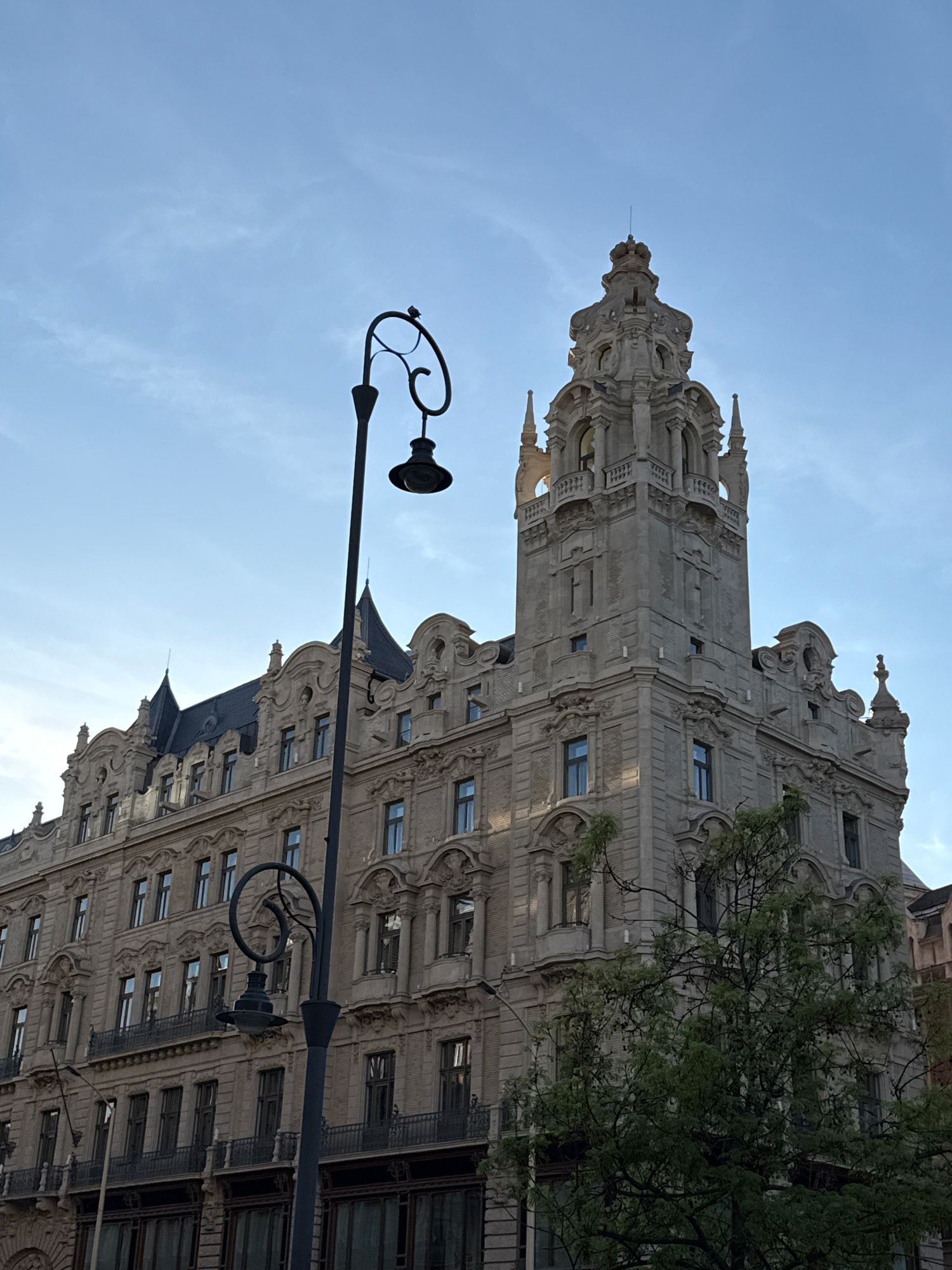 The image shows a low-angle view of a highly ornate, multi-story building, possibly in Budapest, Hungary, due to the architectural style and the presence of a classic street lamp. The building's facade is detailed with numerous windows, balconies, and decorative elements. The architecture appears historic, possibly late 19th or early 20th century. A traditional-style street lamp is visible in the foreground, with a simple black lampshade. The sky is a pale blue with faint clouds, suggesting daytime. A section of a tree with green leaves is also visible on the right side of the building. There are no people visible in the frame. | Open Wire