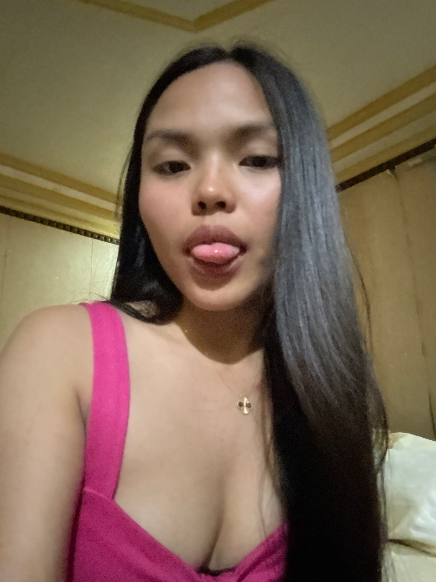 A person with long, dark hair and pink clothing is sticking out their tongue. They appear to be indoors, based on the wall visible in the background. A gold necklace is around their neck. The location…read more