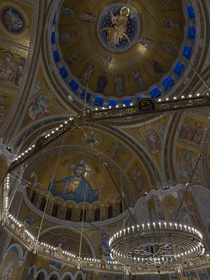 Ornate church ceiling featuring mosaic artwork depicting religious figures. A large, multi-tiered chandelier hangs from the center, adorned with numerous lights. The ceiling is divided into sections w…read more