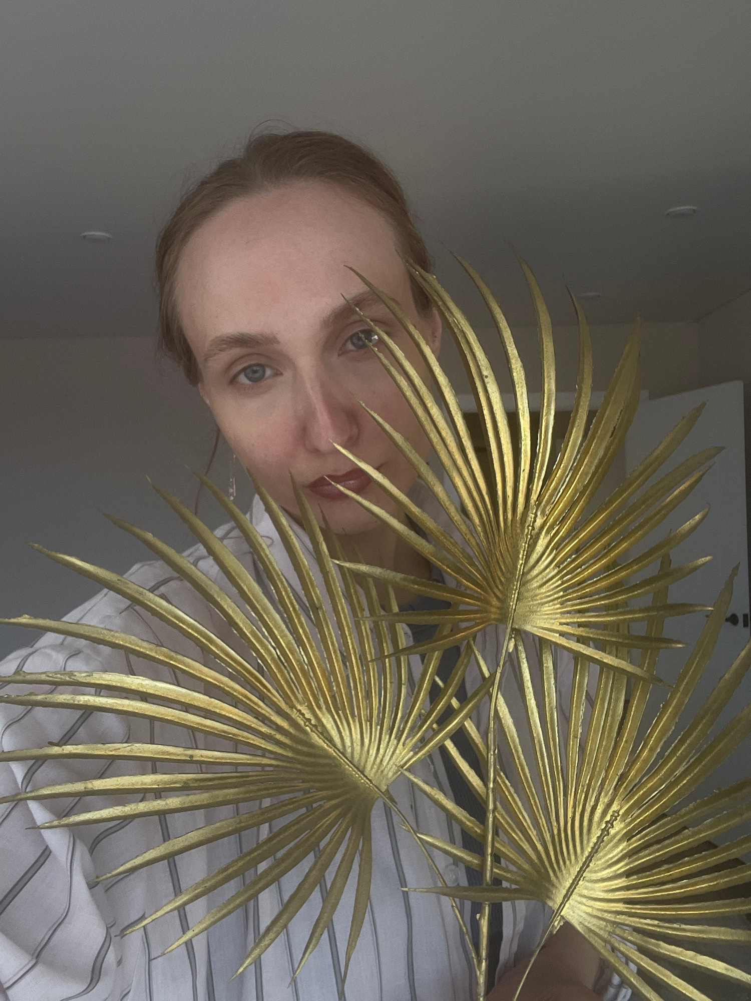 A person with fair skin and light brown hair is posing behind three gold-painted palm leaves. The person is wearing a white and grey striped shirt. The background consists of a grey wall on the left a…read more