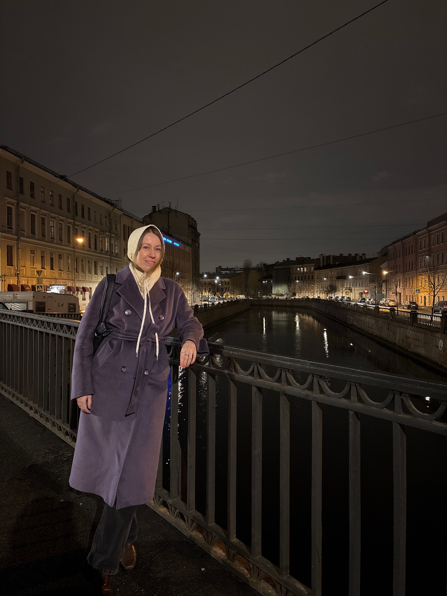 A woman stands on a bridge in Saint Petersburg, Russia. She wears a long purple coat and a light-colored headscarf. The bridge has a dark metal railing. Below, a canal reflects the city lights, which…read more
