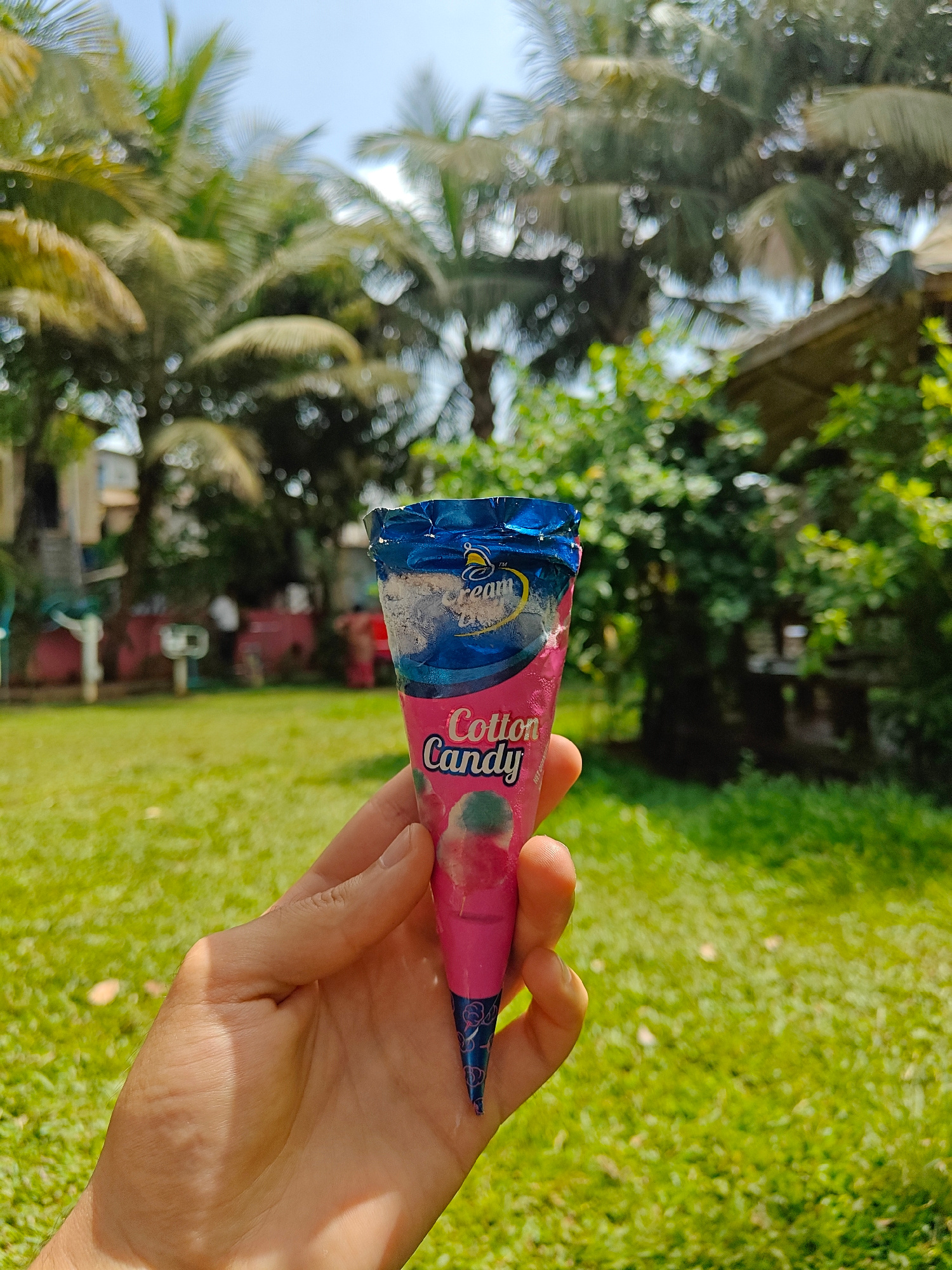 A person holds a sealed "Cotton Candy" ice cream cone in their hand. The packaging is primarily pink and blue. The background consists of a grassy area with trees, including palm trees, suggesting a t…read more