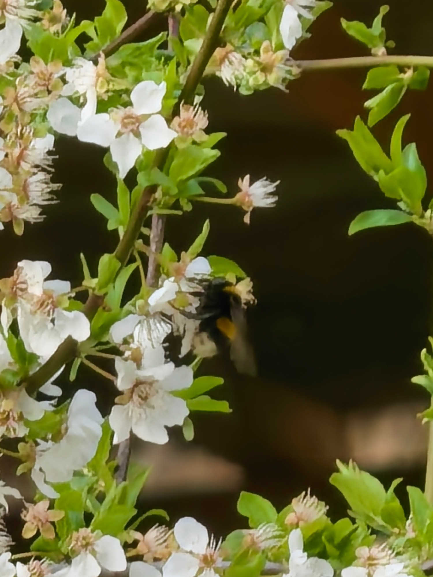 A bumblebee is positioned among a collection of white blossoms and green leaves against a dark background. The composition is a close-up shot, highlighting the bee and the flowers.