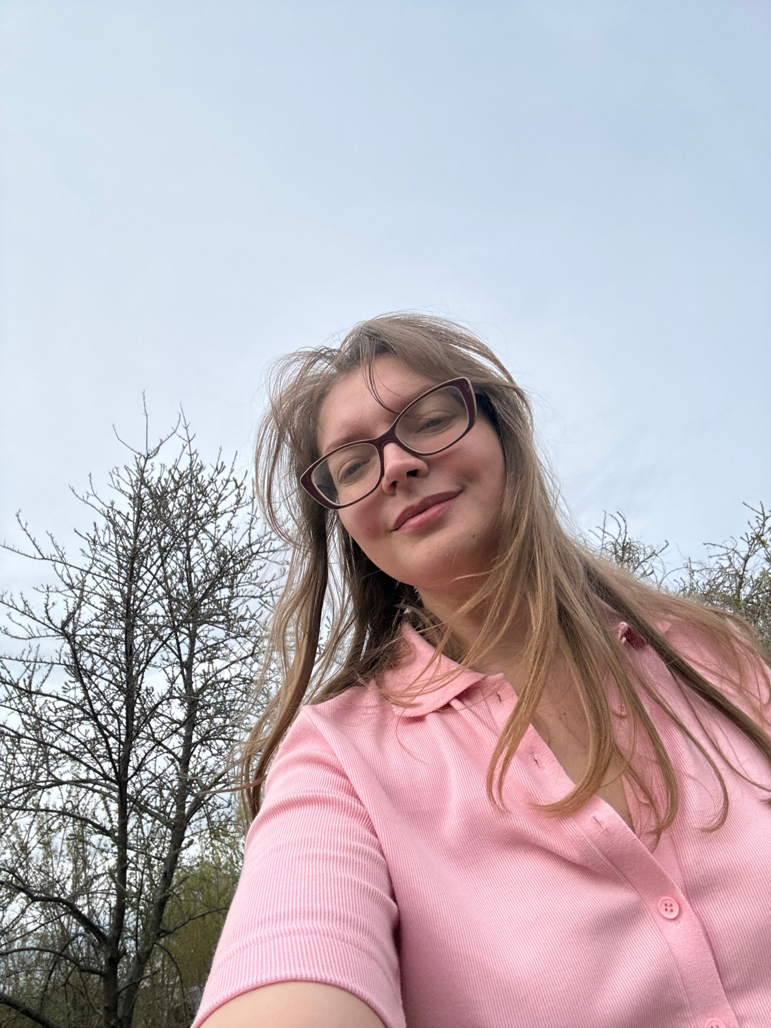 A woman with light brown hair and glasses is wearing a pink cardigan. The background consists of a light grey sky and a tree with bare branches. The location is not specified in the image and cannot b…read more