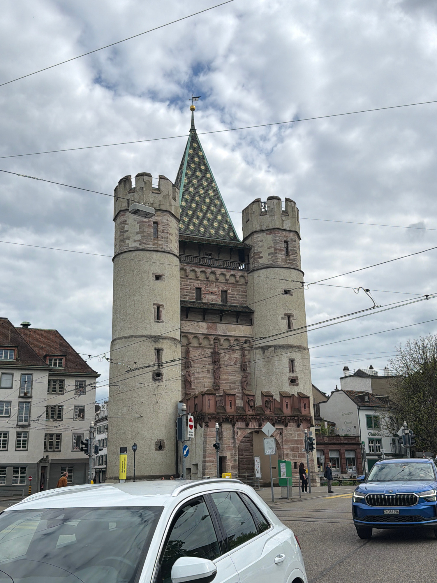 The image captures a vibrant street scene centered around a prominent historic gatehouse in what appears to be an urban European setting, specifically Basel, Switzerland. The gatehouse, a focal point…read more