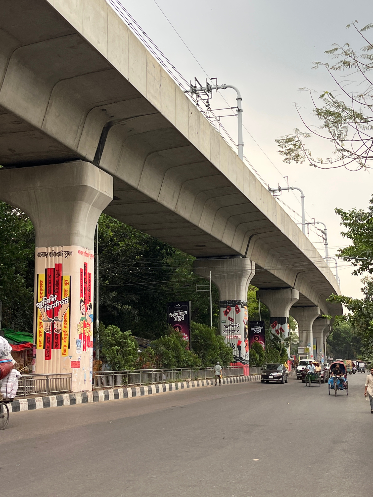 The image shows an elevated metro rail track in Dhaka, Bangladesh. The structure is made of concrete and supported by pillars. The pillars are adorned with banners in Bengali. A road runs along the si…read more