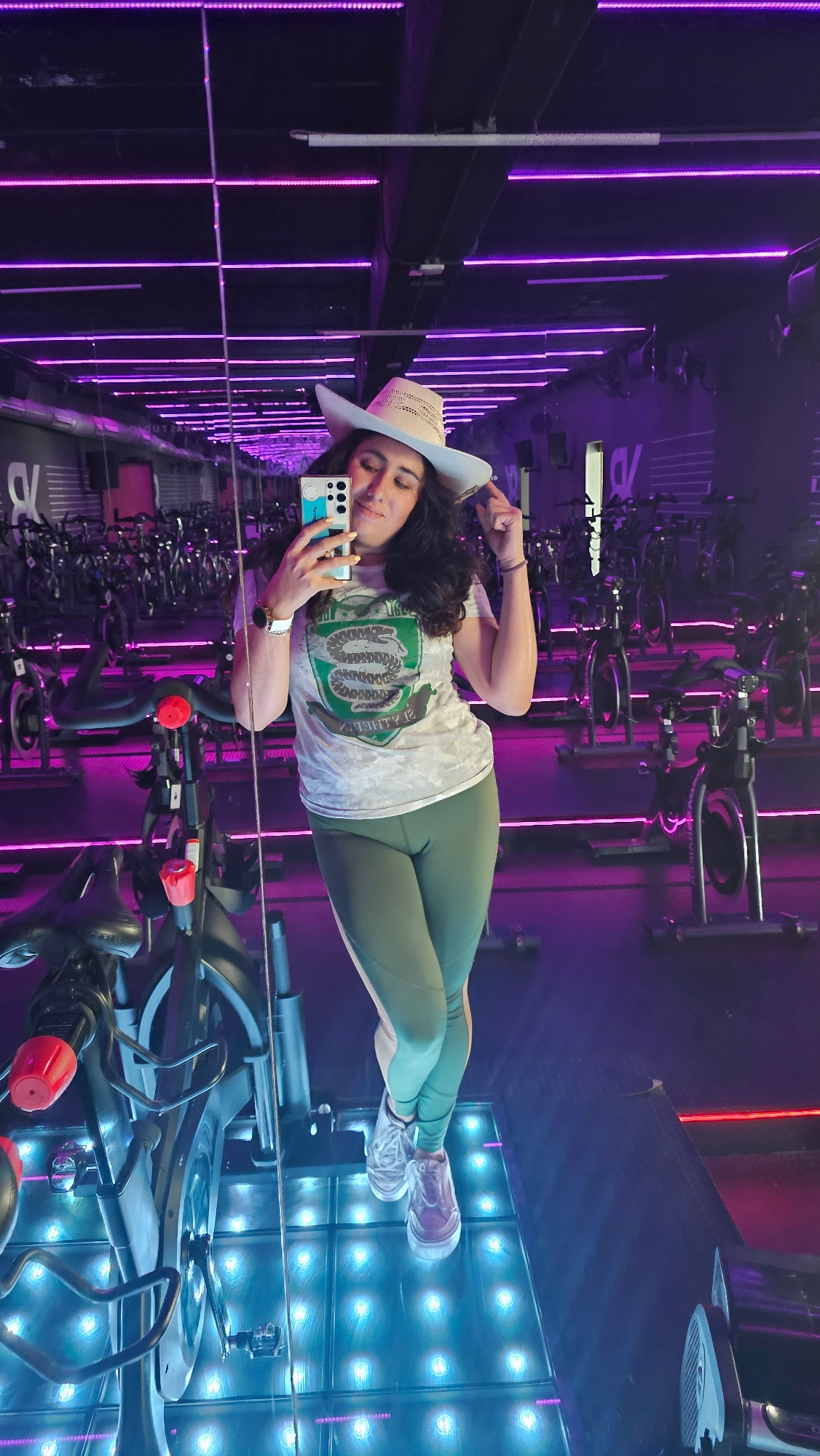 A woman is taking a selfie in a mirror. She is wearing a cowboy hat, a t-shirt with a snake crest, and green leggings. She is holding a cell phone in her left hand. The reflection in the mirror shows…read more