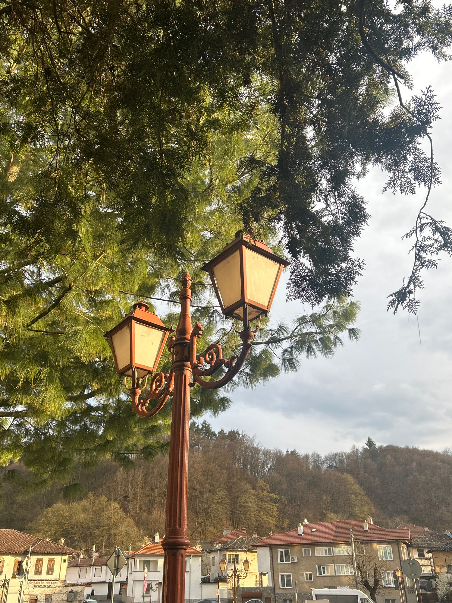 A low-angle shot of a vintage-style, brown-painted metal street lamp with two lantern heads, situated among evergreen trees. The lanterns have cream-colored panels. The backdrop includes a hillside wi…read more