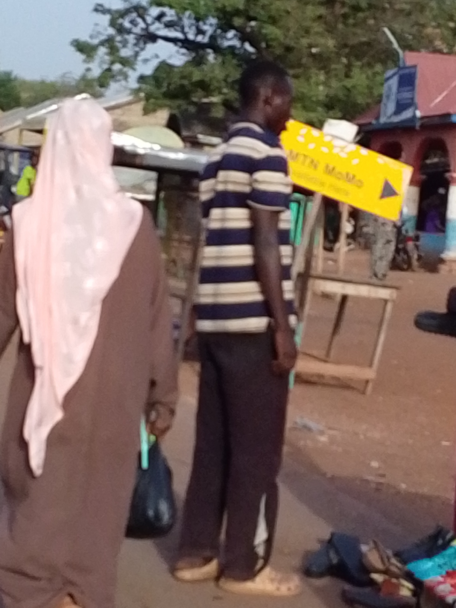 The image captures a street scene in Tamale, Ghana. A woman wearing a brown robe and a light pink headscarf walks with a black plastic bag in her hand. Beside her, a man in a horizontally striped shir…read more