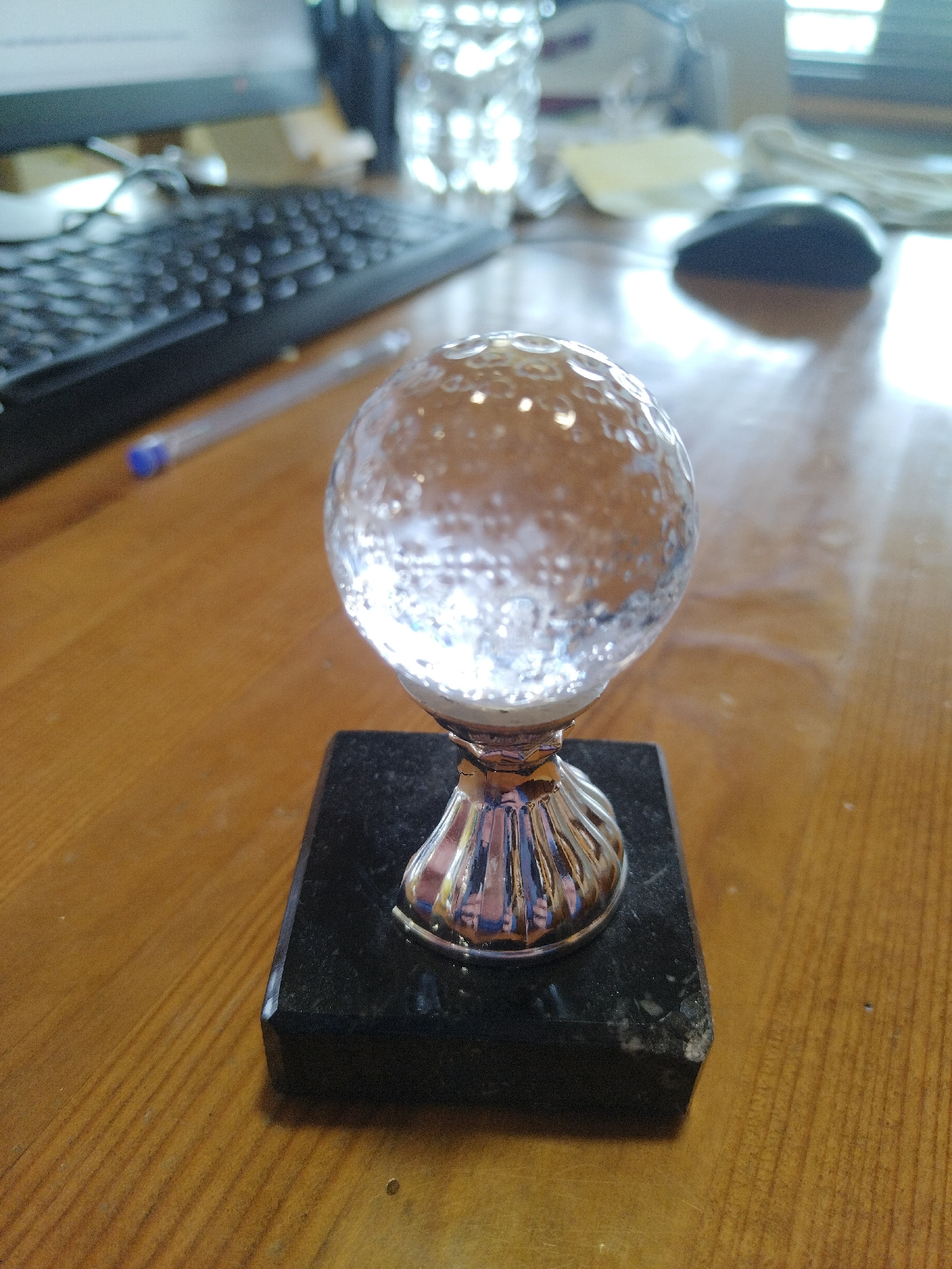 The image shows a crystal golf ball trophy with a shiny, fluted stem sitting on a square, dark-colored base. The trophy is centrally located on a wooden desk or table. In the background, there is a bl…read more
