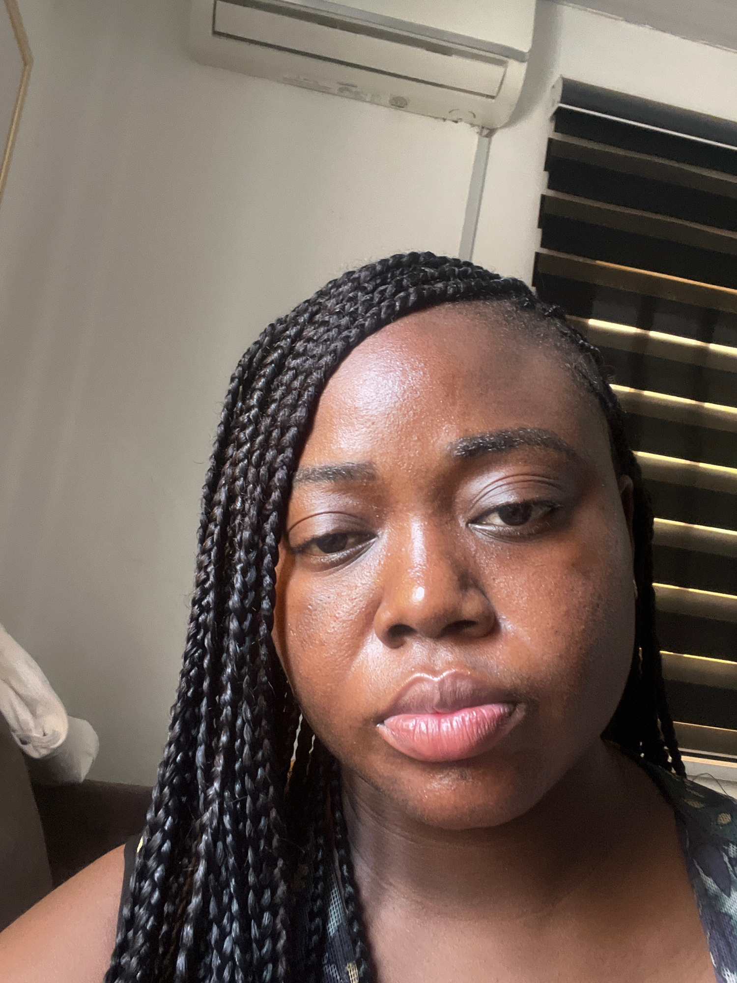 A close-up portrait captures a woman with dark skin and long, dark braided hair (box braids or similar style), rotated 90 degrees clockwise. She looks directly towards the camera with a neutral expres…read more
