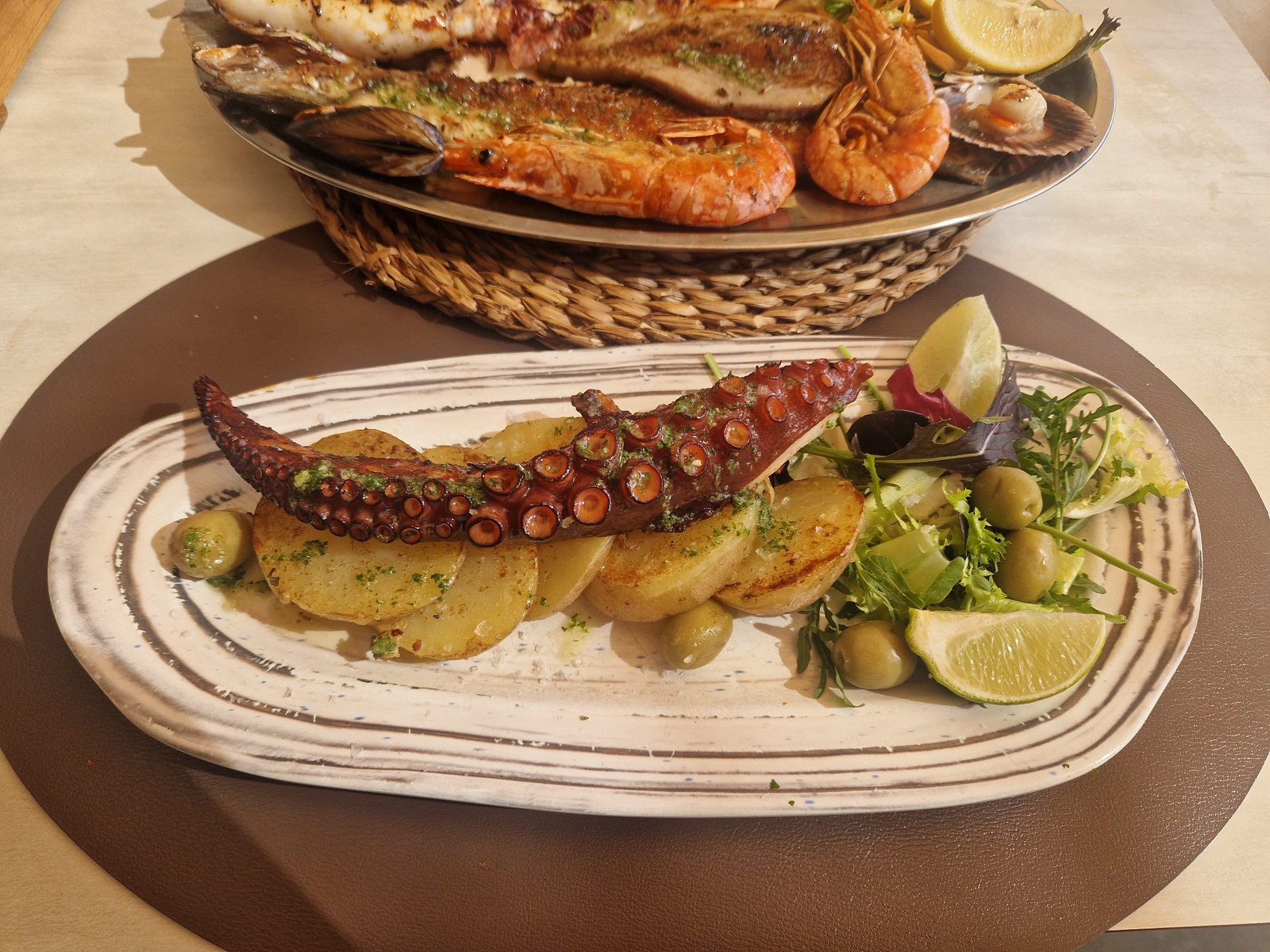 The image showcases two seafood dishes, likely photographed in a restaurant. On top is a white oblong platter with a cooked octopus tentacle laid over golden-brown potatoes. There is also a side sala…read more