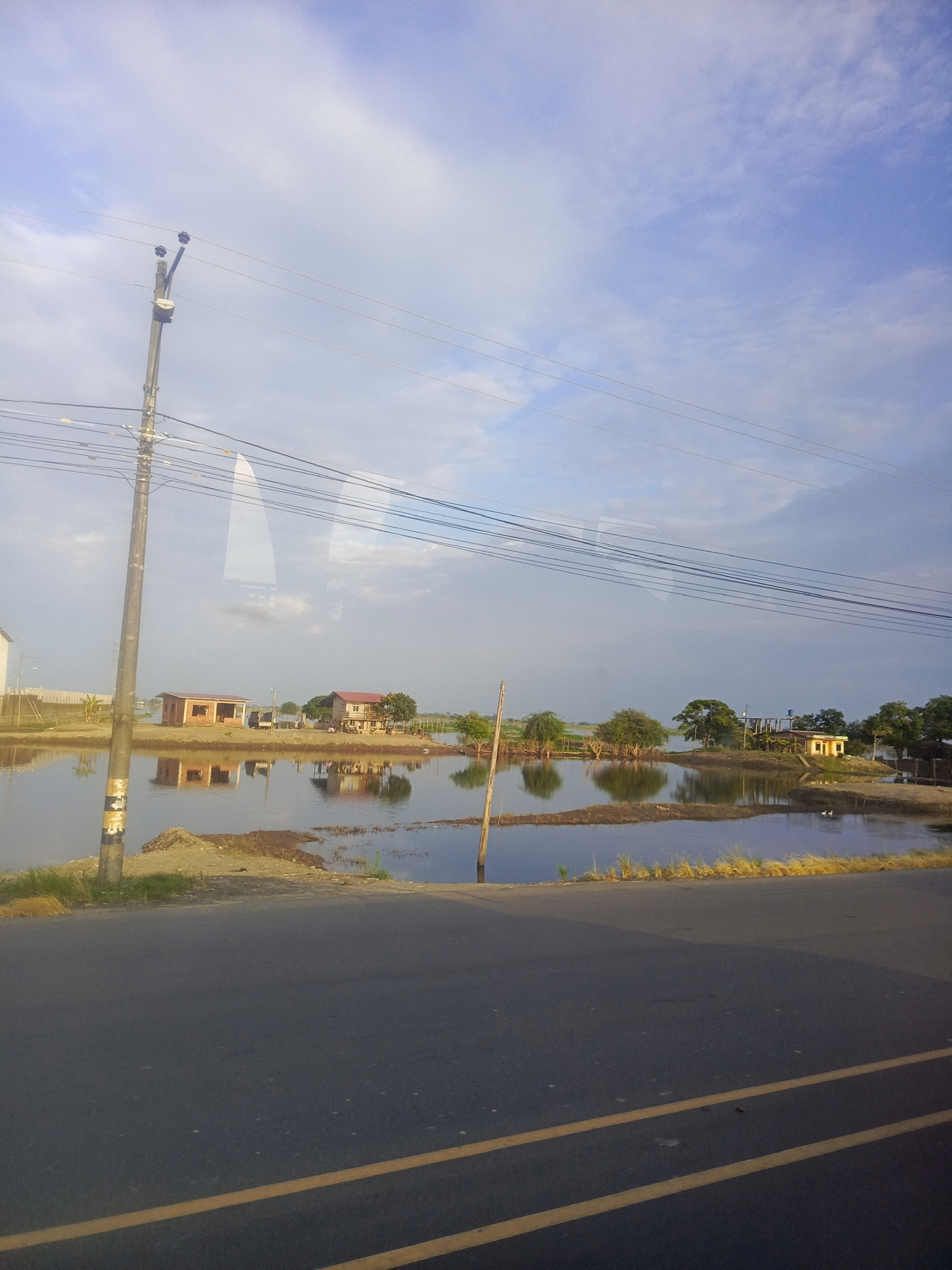 The scene depicts a flooded area next to a road in Babahoyo, Ecuador. Several buildings are surrounded by water, with their reflections visible in the water's surface. Power lines are strung across th…read more