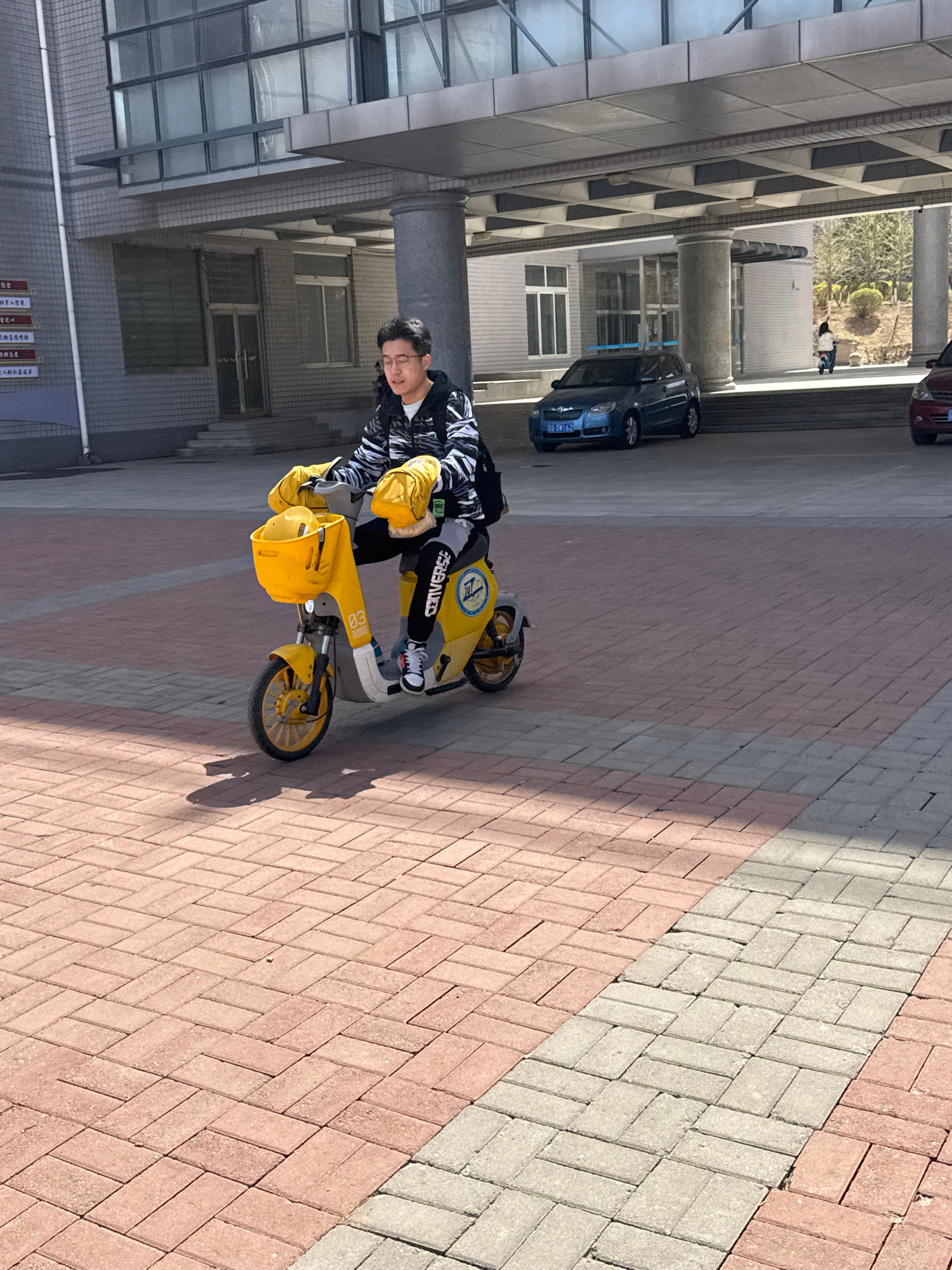 A male stands on a yellow e-bike parked on a brick pathway in Guta, China. He wears a striped jacket, black pants, and Converse sneakers. A building with a gray exterior and multiple windows is behindβ¦read more