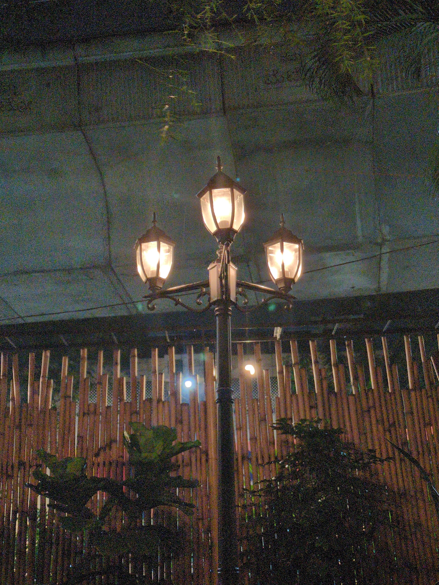 A street lamp with three lights is prominently featured in the image. The lamp is mounted on a pole and is illuminated. To the left of the street lamp is a dark, textured wall. To the right, there is…read more