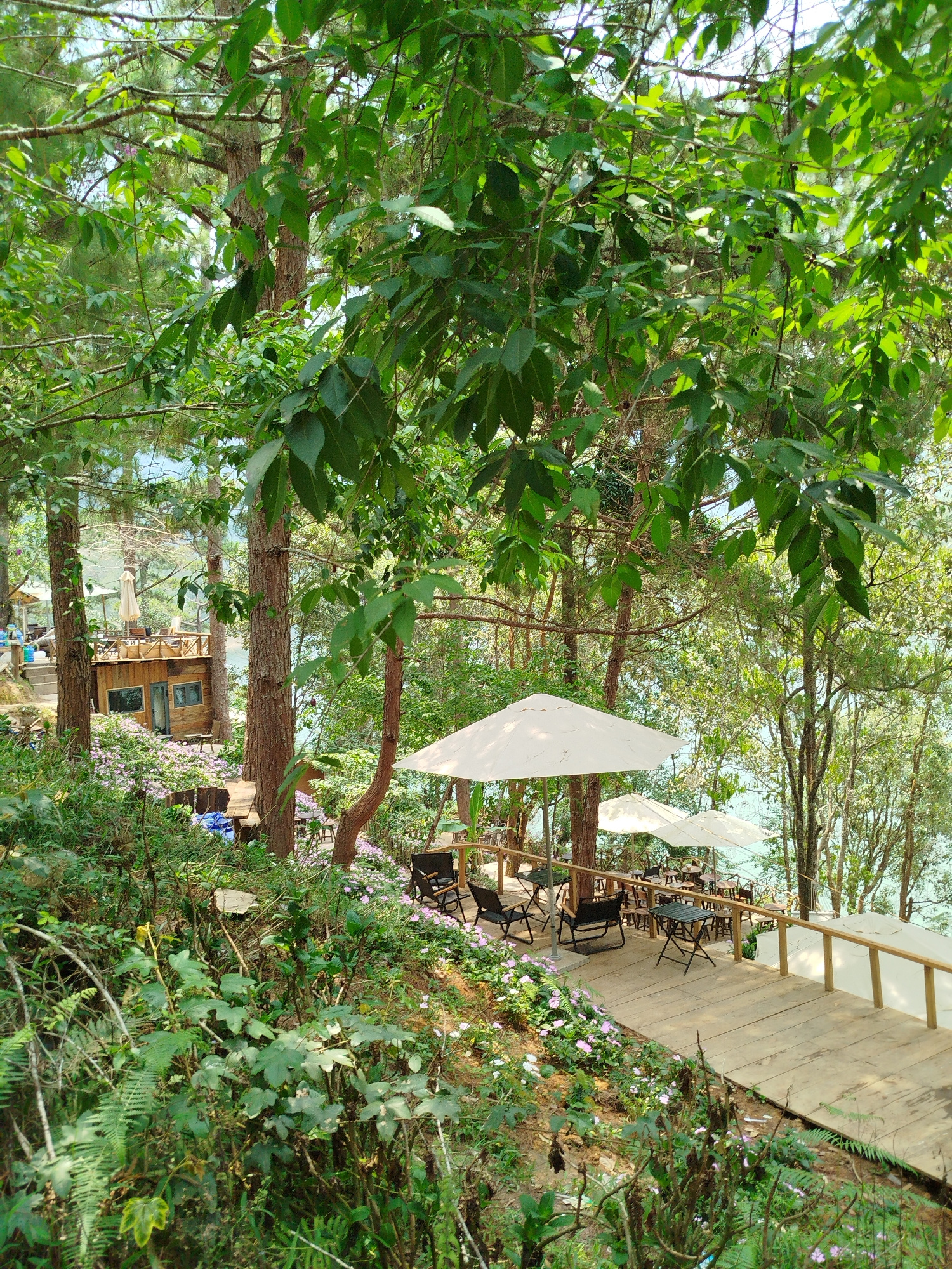 The image depicts a serene outdoor cafe setting in Da Lat, Vietnam, nestled within a forest environment near a body of water. The scene includes a wooden walkway with a simple railing, leading to mul…read more