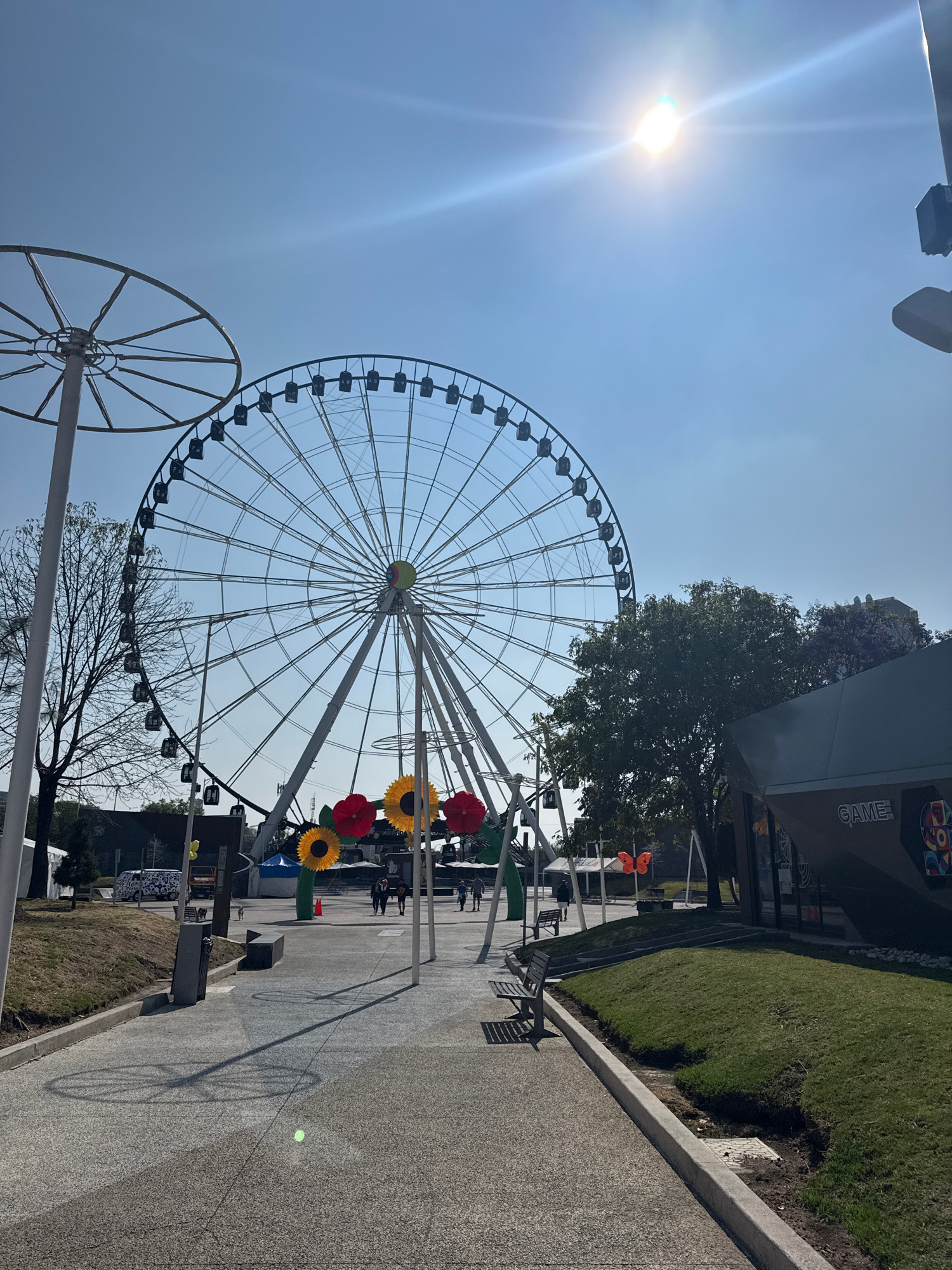 The image shows a large Ferris wheel in Puebla, Mexico, under a bright, clear sky with the sun visible in the upper left. The Ferris wheel is white and features numerous passenger cars. A smaller, par…read more