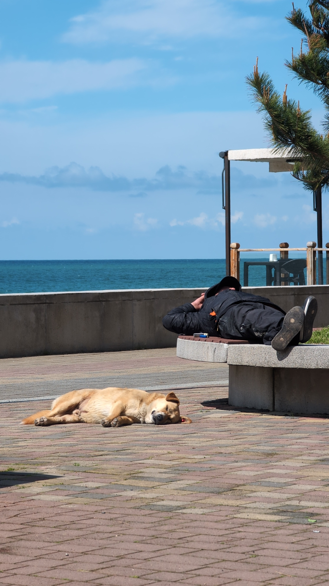 A horizontal, medium-angle shot reveals a sunny outdoor scene in Kobuleti, Georgia. A man reclines on a bench, his head towards the left edge of the frame, feet oriented to the right. He is wearing a…read more