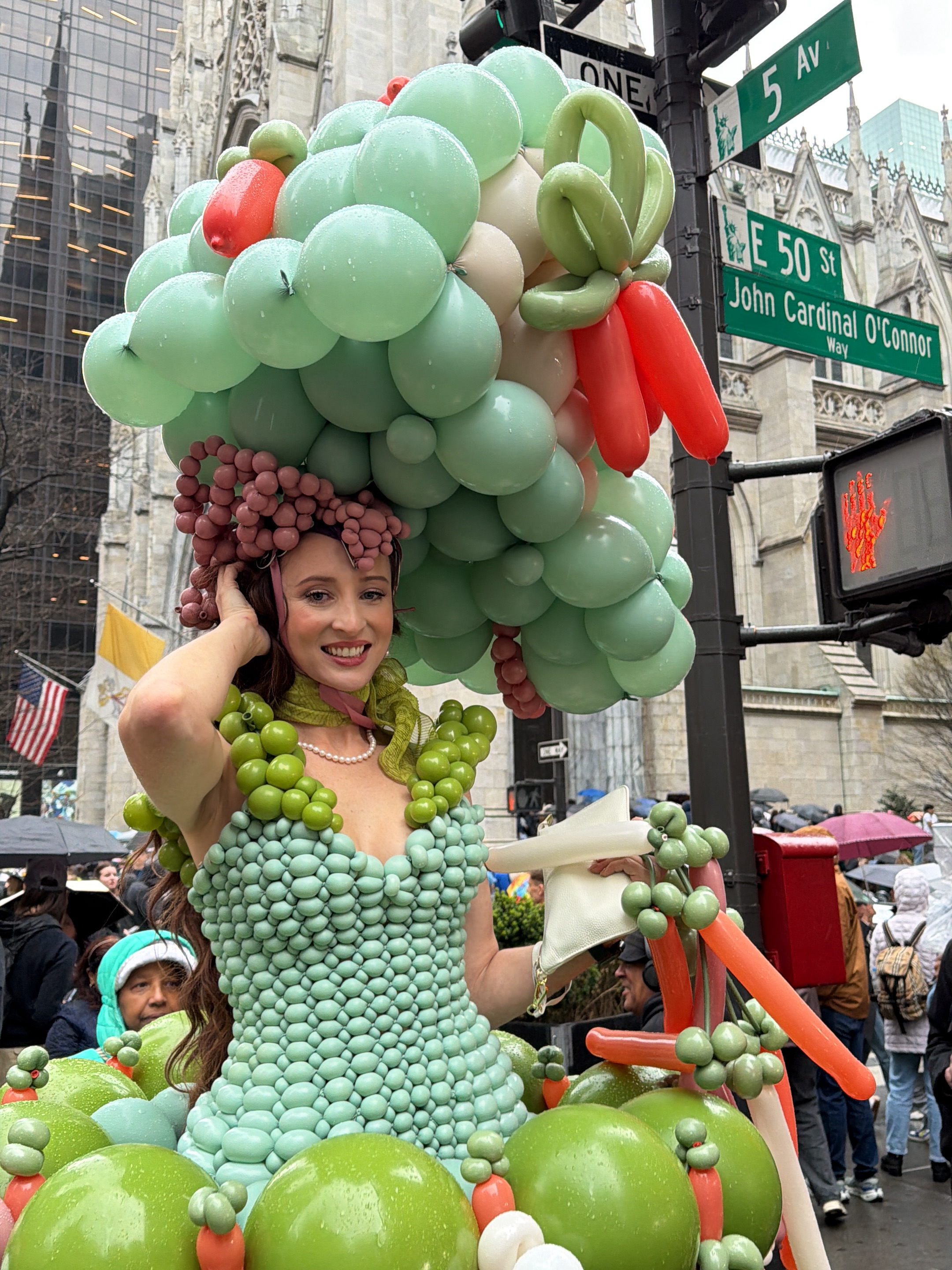 The image shows a woman in a costume made of balloons, likely part of a parade or event. The costume appears to represent produce; she is wearing a headdress of purple balloons, a dress made of light…read more