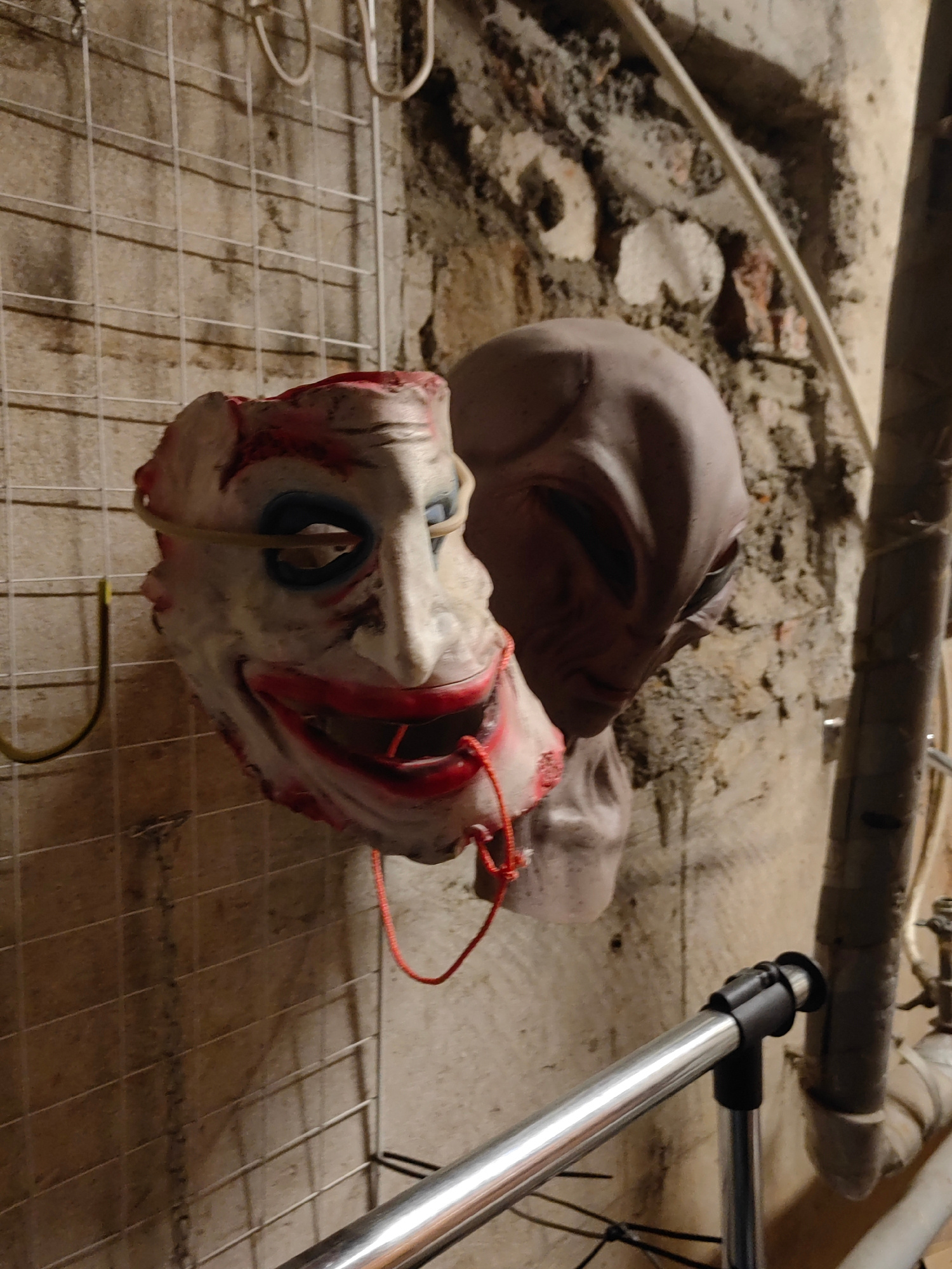 The image shows two masks hanging on a wire grid, likely in an indoor setting. One mask is painted with a clown-like face, featuring red accents around the mouth and eyes. The second mask is a plain,…read more