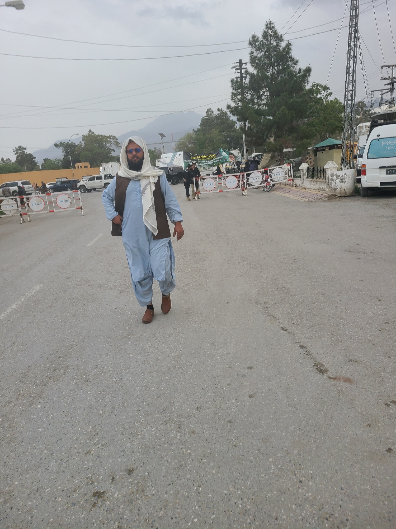 The image shows a man wearing a light blue outfit, a brown vest, and a white head covering. He is standing on a paved road. In the background, there are trees, power lines, buildings, vehicles, and barriers. The photo appears to be taken in Quetta City Tehsil, Pakistan. | Open Wire