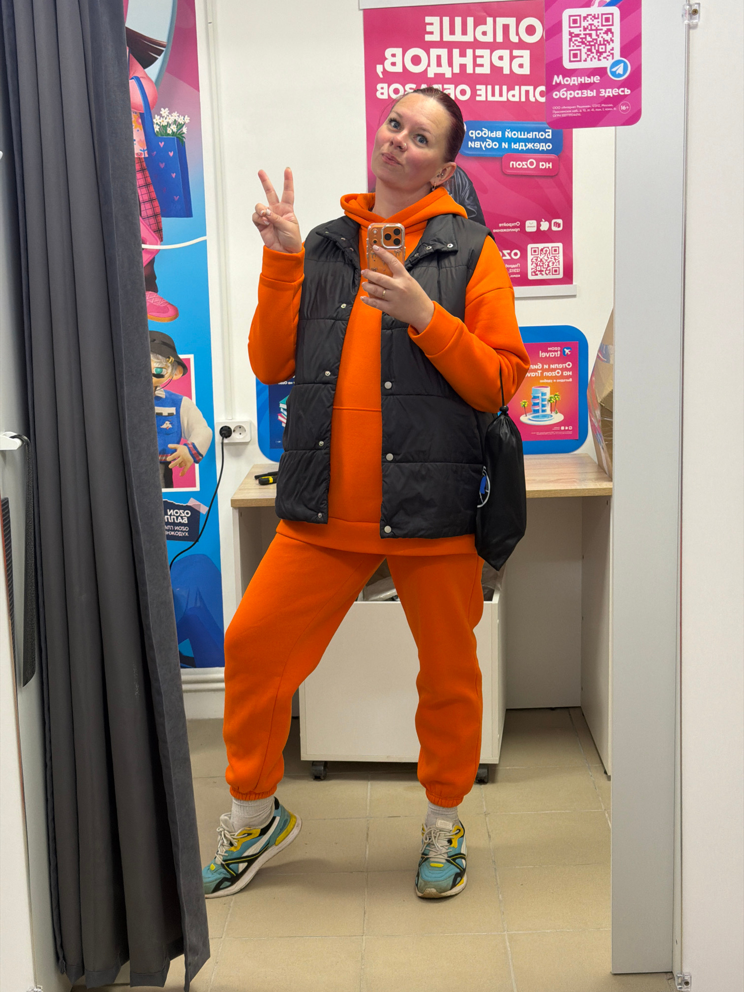 A woman stands at an angle, giving a peace sign while holding a phone in her right hand, wearing an orange hoodie, orange sweatpants, and a black vest, with blue and yellow sneakers. She is in what se…read more