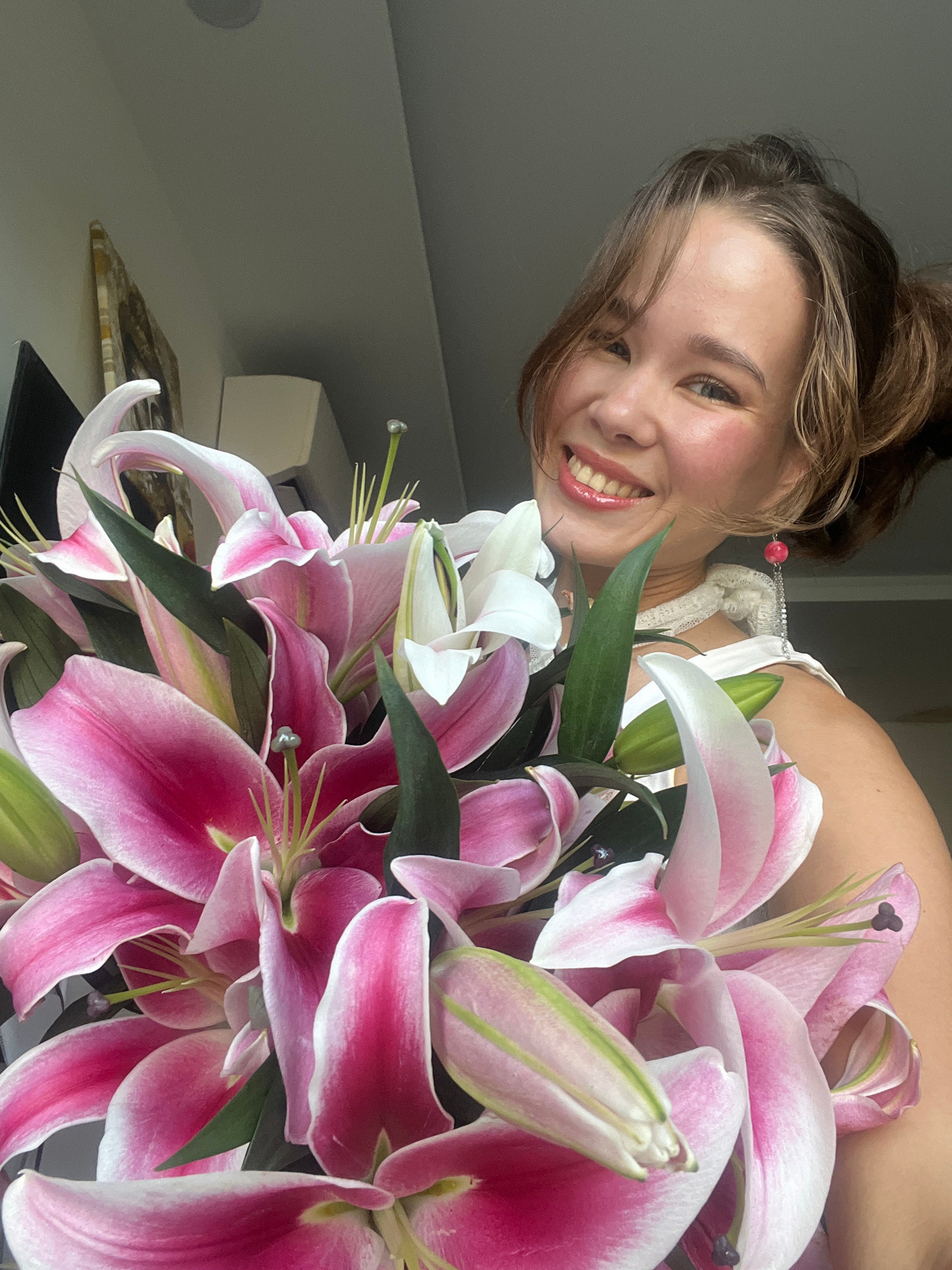 A woman smiles while holding a bouquet of pink and white lilies. She is wearing a white top and an earring with a red bead. The background shows a corner of a room with a white shelf holding various o…read more