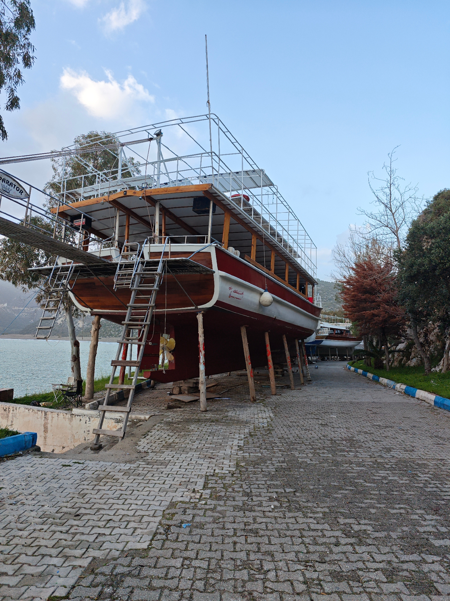 The image depicts a large, two-story wooden boat resting on supports near the shoreline of a body of water. The boat is primarily maroon and white with wooden trim, and has a metal framework on its up…read more