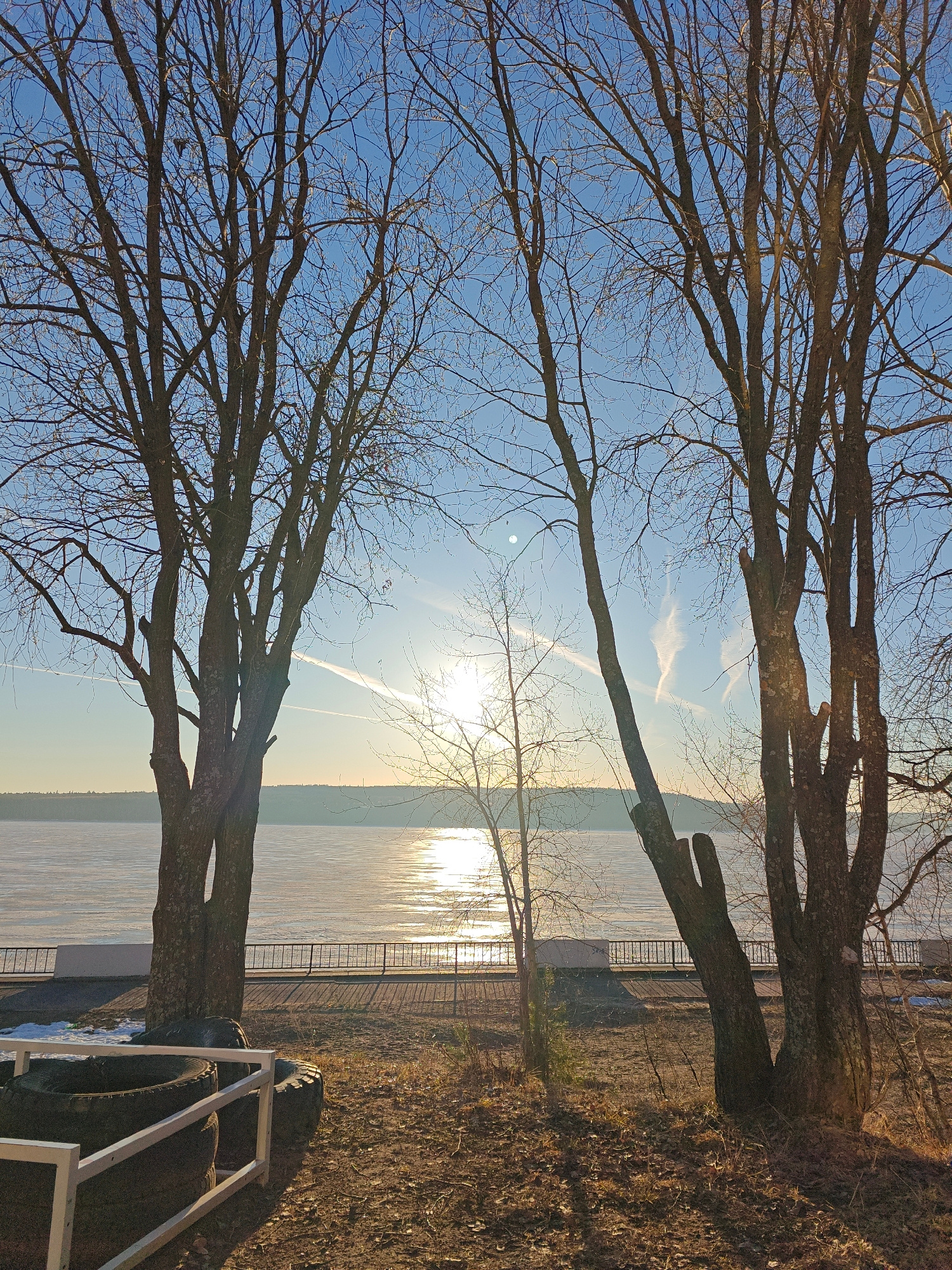 The image shows a waterfront view in Chaikovsky, Russia, at what appears to be sunset or sunrise. A body of water, potentially a lake or river, is partially frozen or covered with ice, reflecting sunl…read more