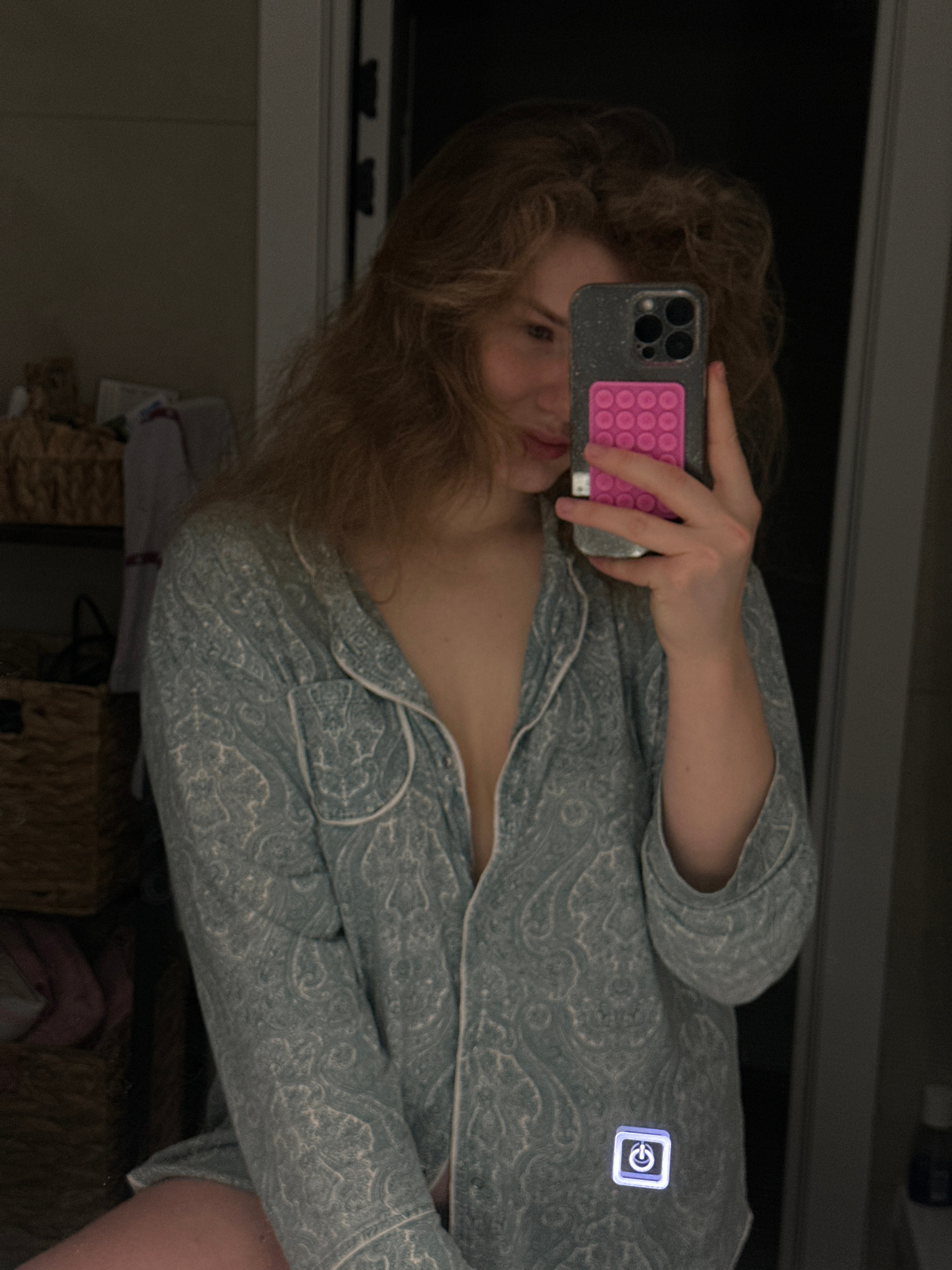 A woman is taking a selfie in a mirror. She is wearing patterned pajamas. Her phone is a dark color with a pink PopSockets grip. The reflection shows part of a room with a black object above her, like…read more