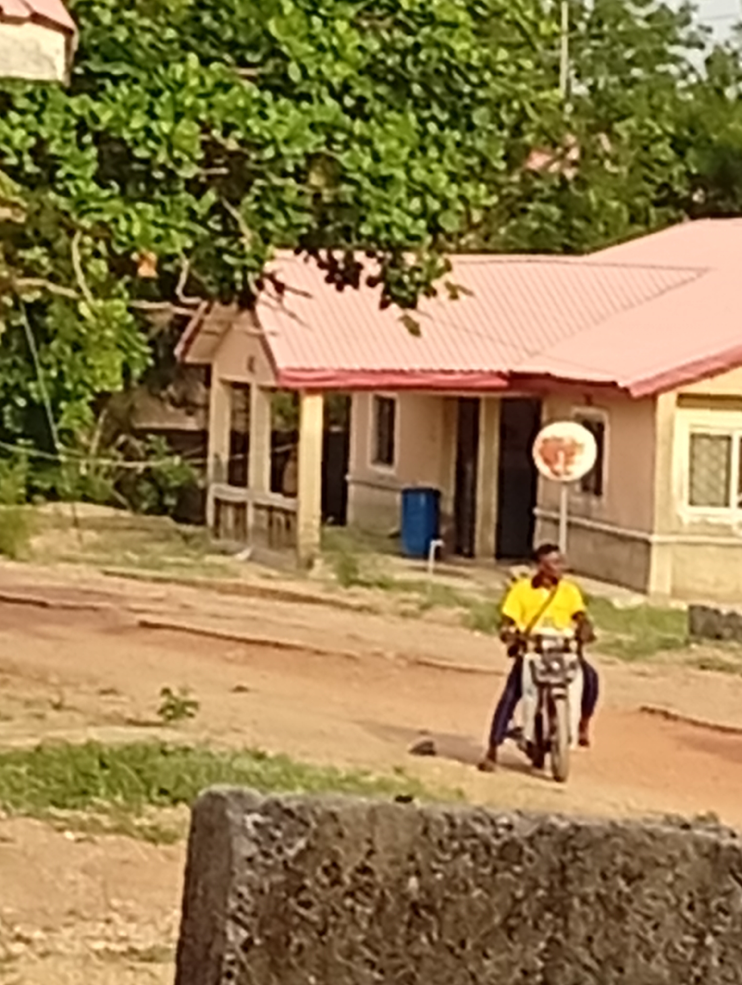 The image depicts a man riding a motorcycle in Adankolo, Nigeria. The setting appears to be a residential area, with low-rise buildings visible in the background. The buildings have pink roofs. The ma…read more