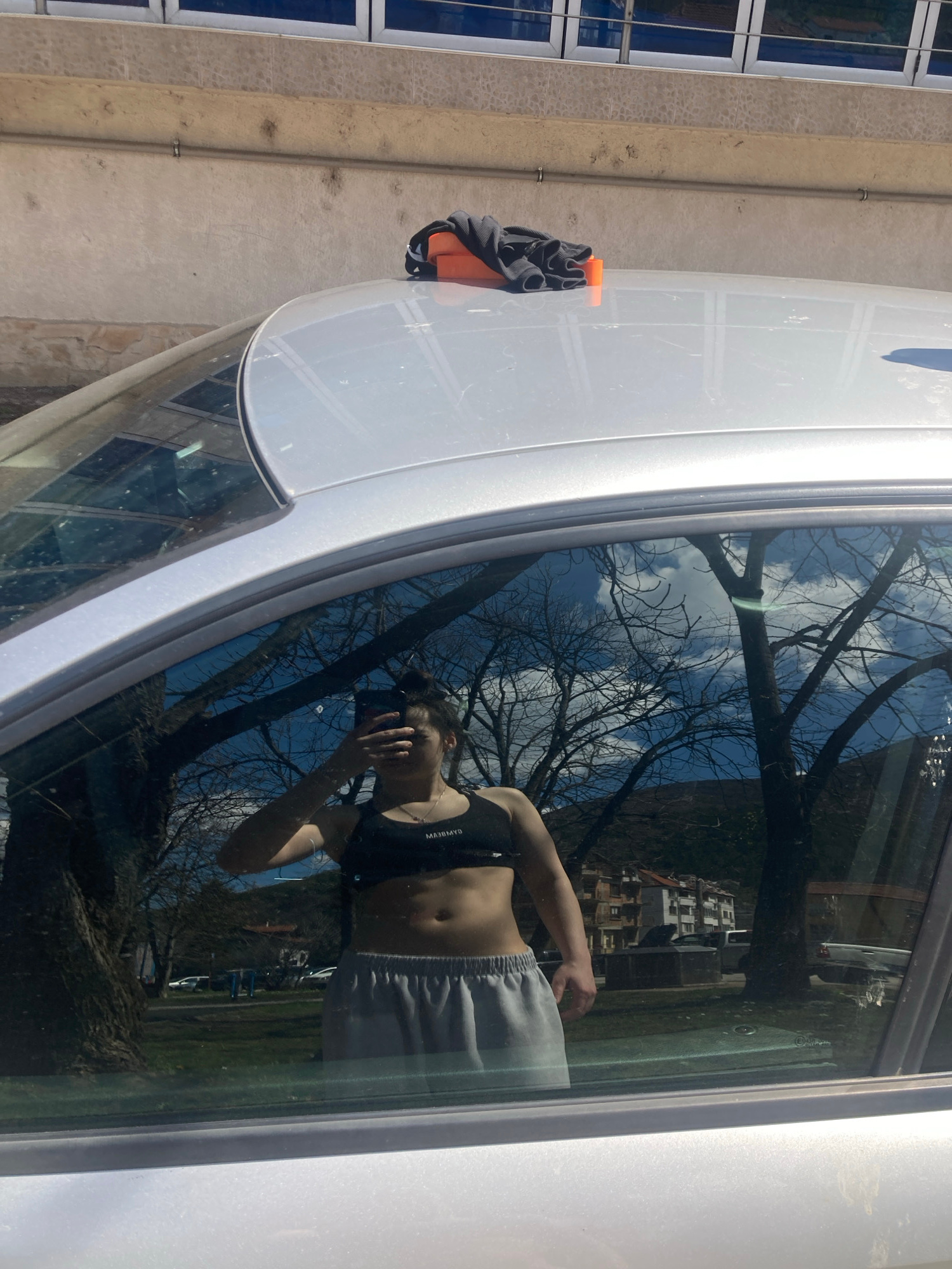 The reflection in the window of a silver car parked on a street in Vratsa, Bulgaria shows a woman in a sports bra and sweatpants taking a picture of herself with a phone. Trees and buildings are also…read more