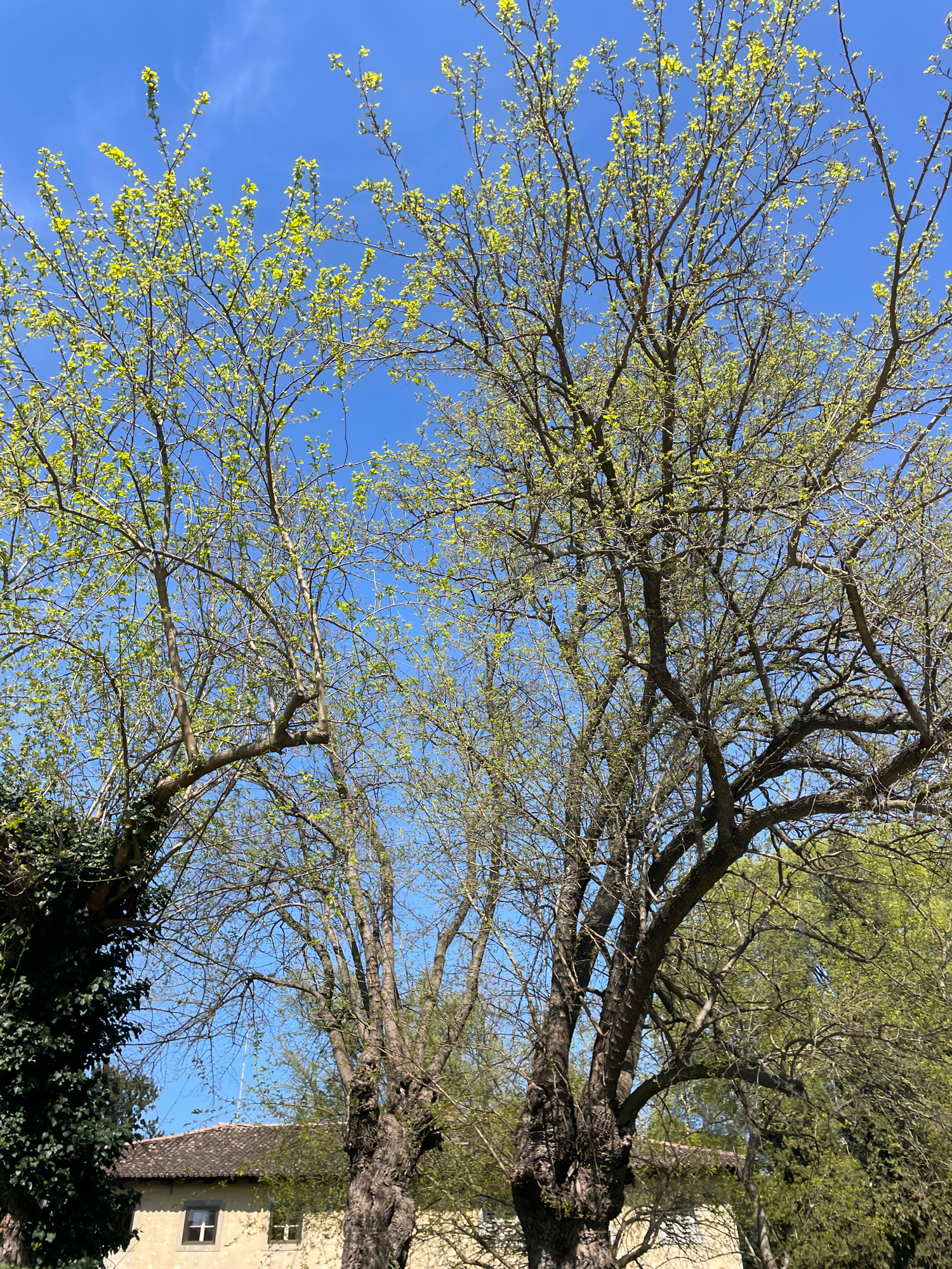 A tree with sparse green leaves and many branches is seen against a clear blue sky. A building is visible behind the tree. The location is San Lorenzo, Italy. The image is taken from a low angle, look…read more
