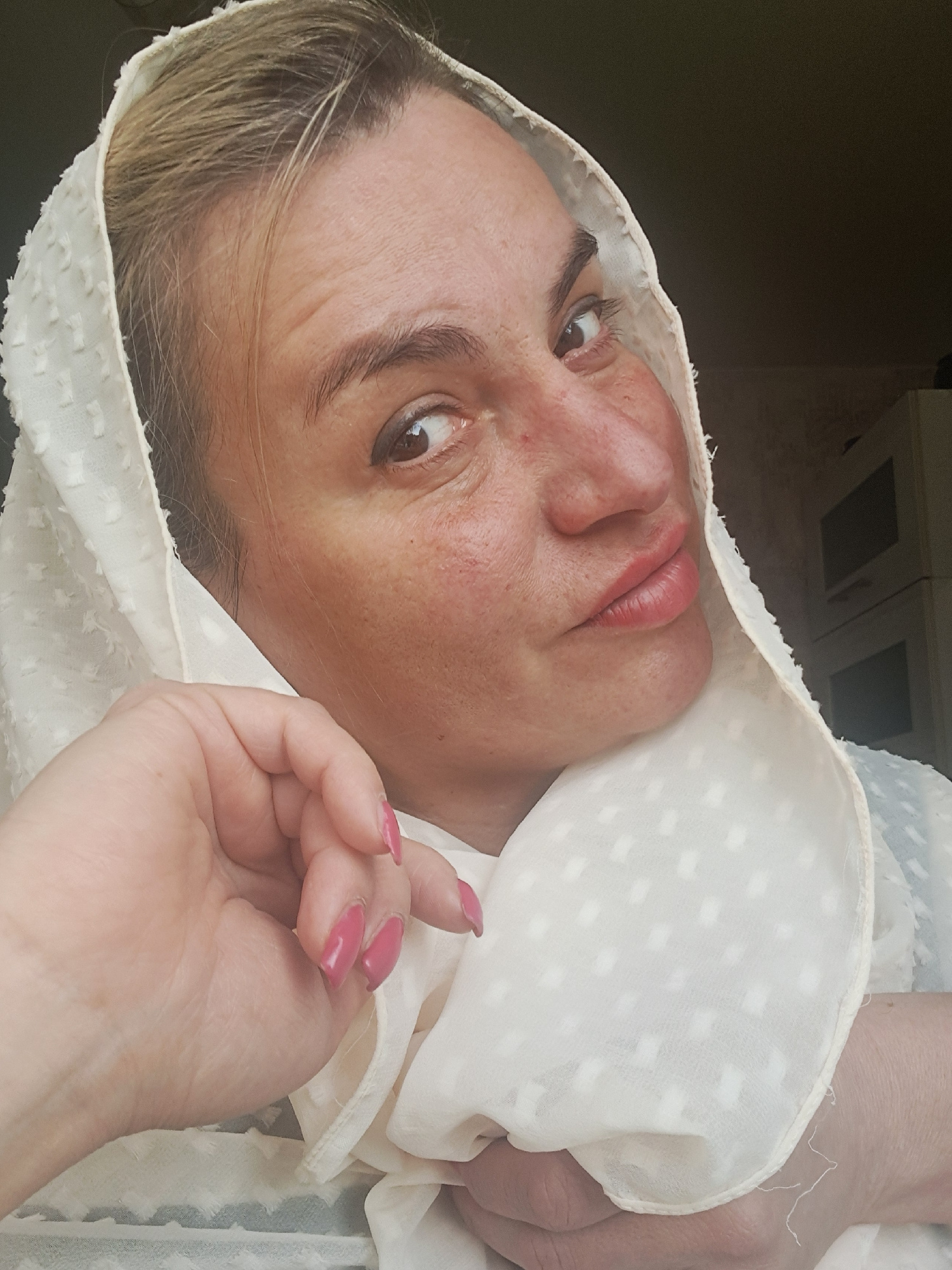 A close-up, rotated portrait shows a woman indoors, possibly in Elektrostal, Russia. She is lying down, looking directly at the camera, with her head tilted to her right. Her face, hands, and shoulder…read more