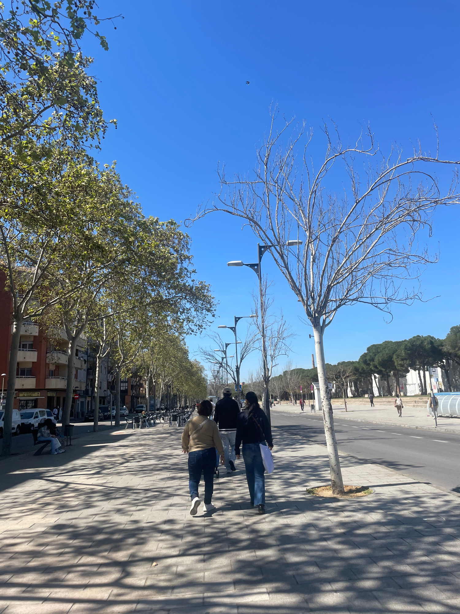 The image shows an outdoor scene in Sant Adrià de Besòs, Spain. A wide sidewalk with light-colored paving stones runs parallel to a multi-lane road. The sidewalk is shaded by the silhouettes of trees,…read more