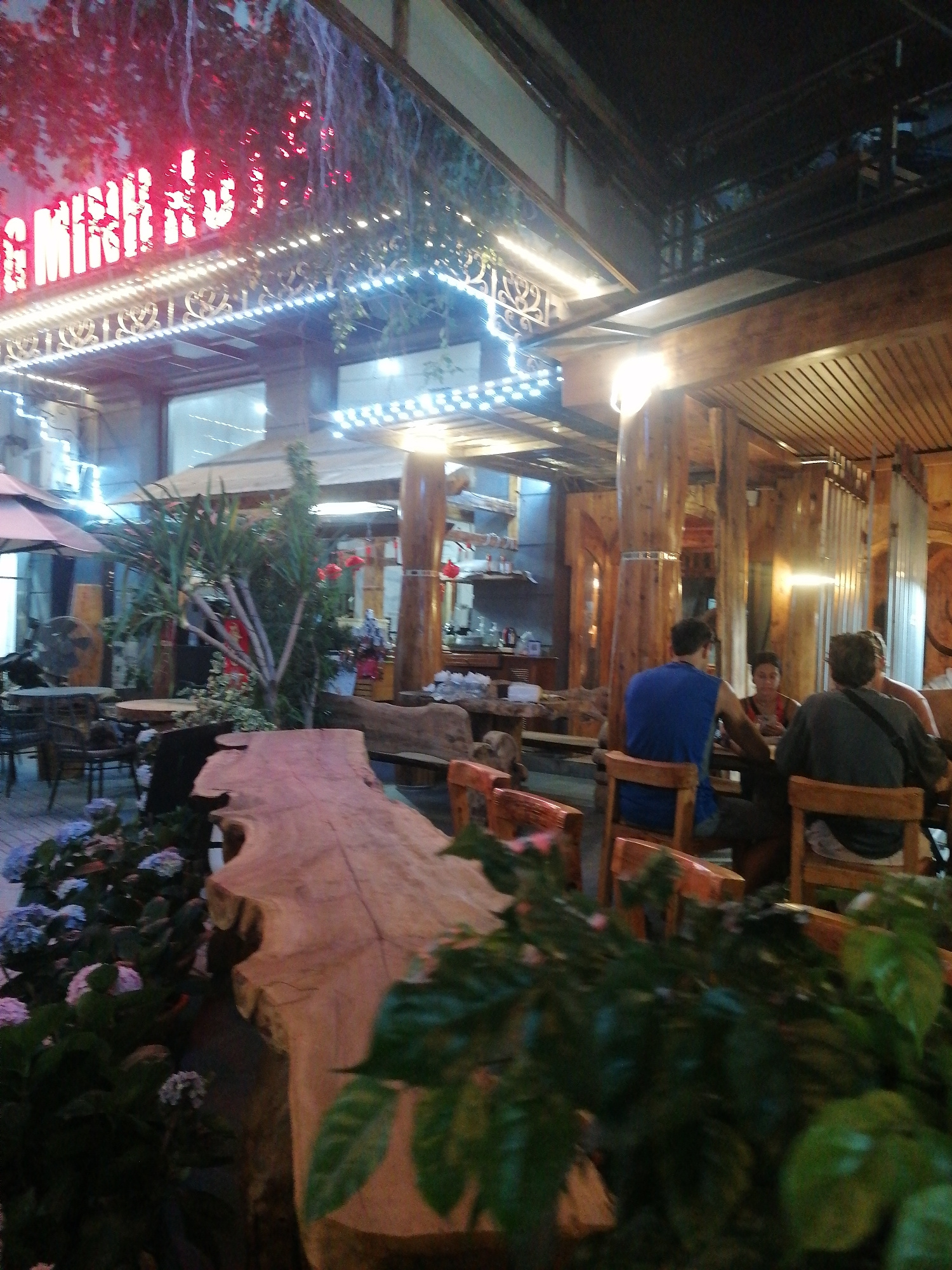 The image depicts an outdoor seating area of a restaurant or establishment in Bai Chay Ward, Vietnam. Overhead, a red neon sign is visible, possibly spelling out "Minh", along with decorative lighting…read more